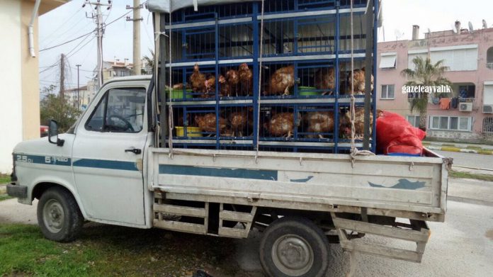 Alınan bilgiye göre; Ayvalık İlçe Jandarma Komutanlığına bağlı Küçükköy Jandarma Karakol ekipleri, sağlık raporu olmadan kanatlı hayvan nakli yapan Ü. Y.C adlı şahsa 5996 sayılı kanuna muhalefetten işlem yaptı. Araçtaki kanattaki hayvanlar, halk sağlığı açısından tehlike arzedip arzetmediğinin belirlenmesi için Gıda Tarım Hayvancılık İlçe Müdürlüğü ekiplerine teslim edildi. Hayvanların taşımacılığını yapan araç sahibi ve şahsa 1603’er lira para cezası yazıldığı öğrenildi.