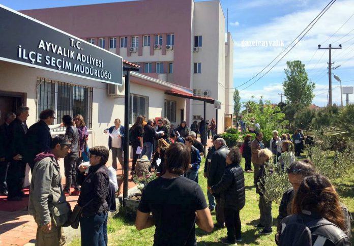 Aralarında Emek Partisi İl Yönetim Kurulu üyesi Mehmet Cemil Tosunoğlu, Emek Partisi İlçe Başkanı Ömer Aslan, CHP ilçe Başkanı Ahmet Toker, ilçe yönetimi, CHP ilçe Kadın Kolları Başkanı Şerife Tezkaçan, CHP Gençlik Kolları Başkanı Muharrem Saygı, Birleşik Haziran Ayvalık Meclisi ve bazı STK temsilcilerinin bulunduğu çok sayıda vatandaş, Salı günü saat 14.00’te Ayvalık Adliyesi İlçe Seçim Kuruluna giderek itiraz dilekçesi verdi. Yaklaşık 100 kişinin verdiği belirtilen dilekçede, ‘YSK’nın 16. 04.2017’de yayınladığı, ‘Sandık Kurulu mührü taşımayan oy pusulası ve zarfların dışarıdan getirilerek kullanıldığı kanıtlanmadıkça geçerli sayılmasına karar verilmiştir’ duyurusu esas alınarak yapılan tüm oy sayım ve döküm işlemlerinin iptaline karar verilmesi’ talep edildi.
