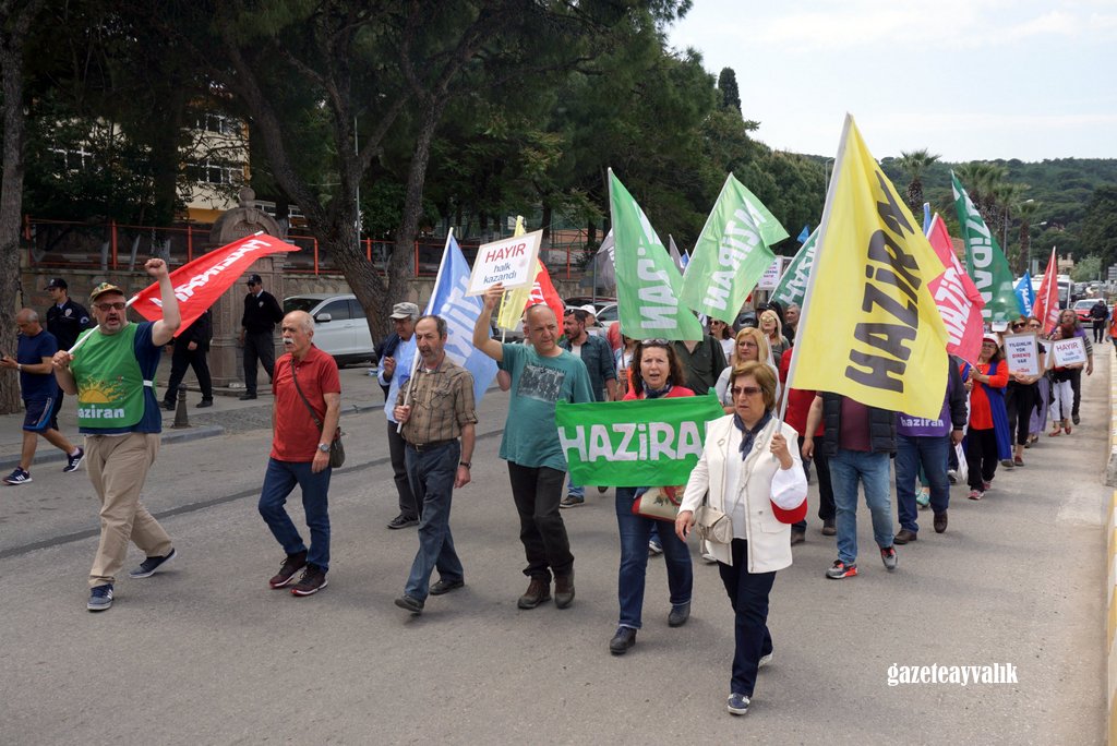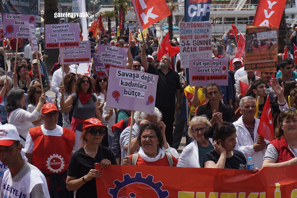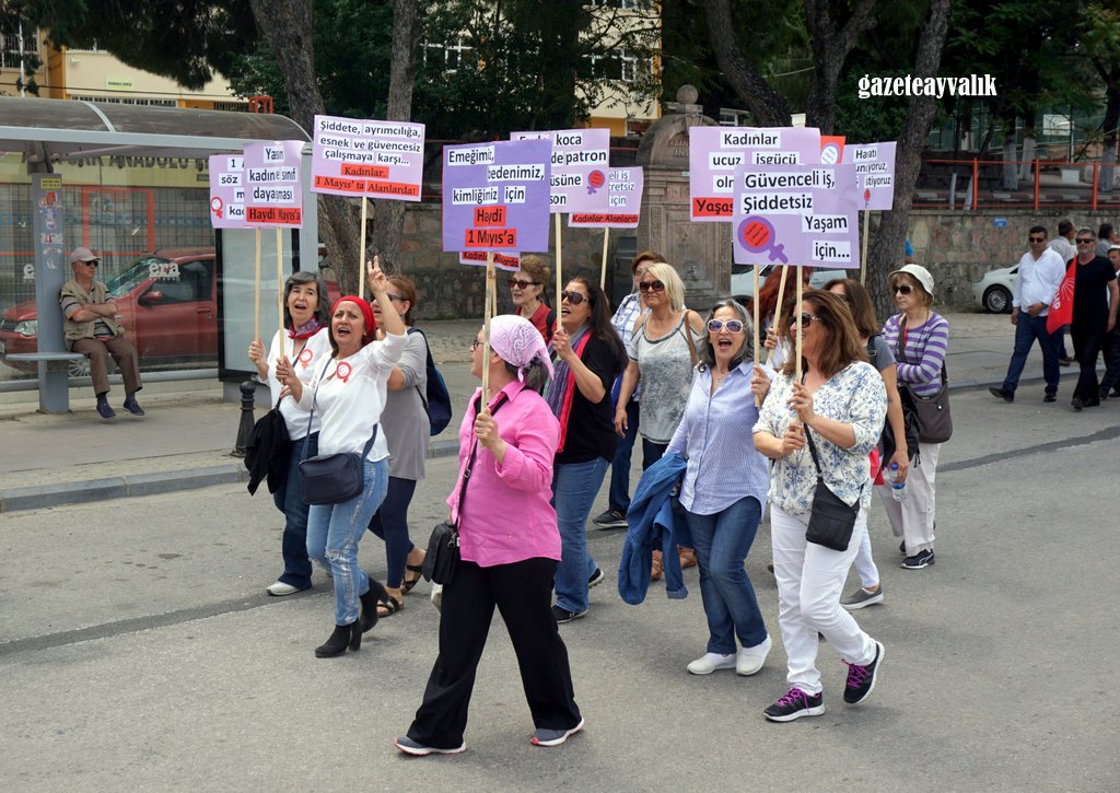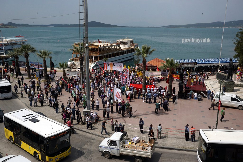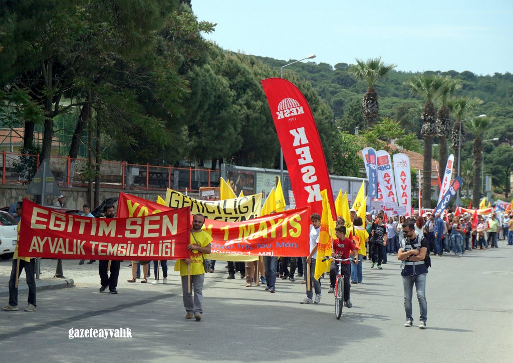Siyasi iktidarın yıllardır işçilerin taleplerine yanıt vermediğini söyleyen Eğitim-Sen Ayvalık Yürütme Kurulu üyesi Halis Çalık, “Türkiye ‘de maalesef 1 Mayıs’lar iktidarların getirdiği yasaklar ve devlet şiddetinin gölgesi altında kutlanmaktadır. 365 gün bu ülkenin tüm değerlerini ve güzelliklerini üretenlere bir gün dahi saygı gösterilmemektedir. 2017 1 Mayıs’ı, hile hurda ile dayatılan tek adam rejimine karşı demokrasi için, giderek derinleştirilen ve bizi Orta doğu’daki çatışmaların ateşine sürükleyen savaş politikalarına karşı barış için giderek pervasızlaşan emek düşmanlığına karşı emeğin hakları için, Olağanüstü Hal’e, Kanun hükmünde kararnamelere ve tek adam rejimine, kıdem tazminatının gaspına hayır demek için 1 Mayıs’ta alanlardayız. Milyonlarca taşeron işçinin umutlarını yıllardır aldatmacalarla sömürenlere, 1 Kasım 2015 seçimlerinden önce taşeron kadro vaat edip sözünde durmayanlara, kamu emekçilerinin 657 sayılı yasadan kaynaklanan iş güvencelerini ortadan kaldıracaklarını açıklayıp milyonlarca kamu emekçisine güvencesiz çalışmayı dayatanlara hayır demek için alanlardayız.” dedi.