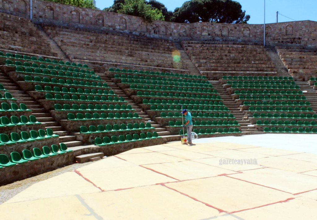 Ayvalık Belediyesi Kültür ve Sosyal İşler Müdürlüğü, Açık Hava Tiyatrosu’nda konser ve etkinlikler öncesi bakım çalışması yapıyor. Tiyatro yeni sezona, yenilenmiş kulisler, sahne ve sayısı arttırılıp düzenlenen tuvaletlerin yanı sıra izleyici ve dinleyiciler için konulan 1500 adet yeni koltuk ile girecek.