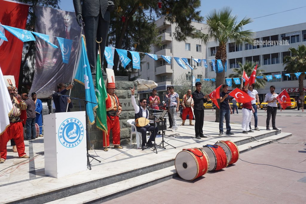 Ülkü Ocakları Eğitim ve Kültür Vakfı Ayvalık İlçe Başkanlığı tarafından düzenlenen kutlama etkinliği, saat 12.00’de Ülkü ocaklarından başlayan ve Mehteran eşliğinde Talatpaşa Caddesi’nden geçilerek Cumhuriyet Meydanı’na yapılan yürüyüşle başladı. Ülkü Ocakları Eğitim ve Kültür Vakfı Ayvalık İlçe Başkanı Emin Necdet Öner, Ülkü Ocakları yönetimi, Balya Belediye Başkanı Osman Kılıç, İlçe Jandarma Komutanı Yüzbaşı Özay Dörttepe, İlçe Emniyet Müdürü Fikret Bakır, İlçe Meteoroloji Müdürü Mehmet Emin Yılmaz, Vergi Dairesi Müdürü Adem Torun’un yanı ülkücü gençlik ve vatandaşlar katıldı.