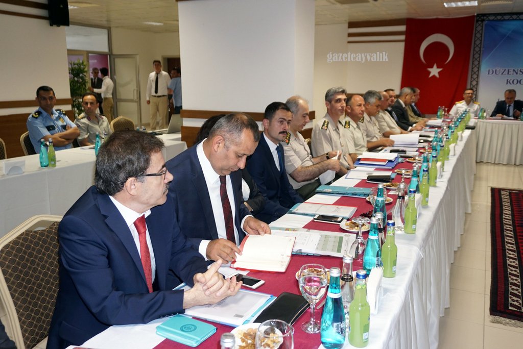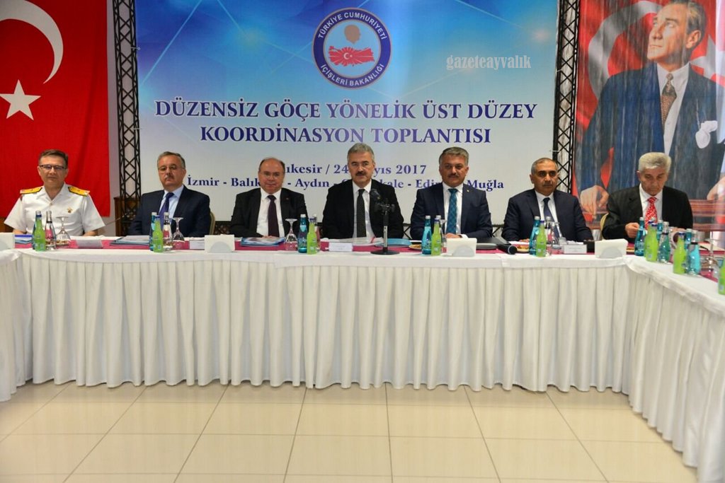 Toplantının düzensiz göç ve göçmenlerle ilgili Valilikler bünyesindeki kurumlar arasındaki işbirliği ve dayanışmayı arttırmak, Bölgedeki düzensiz göçün önlenmesi için alınması gerekli emniyet tedbirlerini değerlendirmek ve yakalanan düzensiz göçmenlerin işlemlerinin koordine içerisinde düzenli ve programlı bir şekilde yapılması için gerekli planlamalar hakkında bilgi paylaşımında bulunmanın yanı sıra olabilecek sorunların çözülebilmesi ve alınması gereken diğer ilave tedbirleri görüşmek amacıyla düzenlendiği açıklandı. Sahil Güvenlik Komutanlığı Ege Denizinde yaşanan düzensiz göç olaylarının güncel durumu ve alınan tedbirleri anlattı. Alınan bilgiye göre 1 0cak-22 Mayıs 2017 tarihleri arasında Ege Denizinde Sahil Güvenlik tarafından 5 bin 123 göçmen ile 38 organizatör yakalandığı, 19 göçmenin ise hayatını kaybettiği öğrenildi. Koordinasyon toplantı sonuçlarının açıklandığı toplantıda düzensiz göçle mücadeleye yönelik gelişmeye açık alanlar, öncelikler görüşüldü ve izlenecek yol haritası belirlendi. Toplantı sonrası Ali Bey (Cunda) Adasına geçen heyet için Taksiyarhis Anıt Müze ile tekne gezisi düzenlendi.