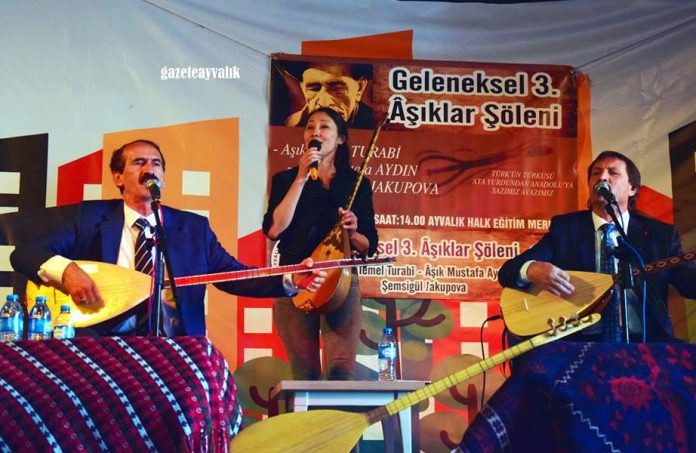 Ayvalık Halk Eğitim Merkezi ve Ayvalık Anadolu Lisesi işbirliği ile Bengi Projesi kapsamında gerçekleştirilen Aşıklar Şöleni, öğretmenler ve kursiyerler kadar öğrenciler tarafından da ilgiyle izlendi. Geleneksel Âşıklık Sanatı hakkında farkındalık oluşturarak kültürel birikimin yeni nesillere tanıtılması amacıyla düzenlenen şölen, 23 Mayıs günü saat 13.30’da başladı. Teması, ‘Yesevi’nin İzinden, Dedem Korkut Sazından, Yunus Emre Özünden, Âşık Veysel Gözünden, Ata Yurdundan Anadolu’ya’ olan şölene konuk olarak Erzurumlu Âşık Temel Turabi, Karslı Âşık Mustafa Aydın ve Kazakistanlı Dombra Sanatçısı Şemsigül Jakupova katıldı. Aşıklar, koşma, türkü, doğaçlama şiir, lebdeğmez, atışma gibi çeşitli halk şiiri türlerinin örneklerini sundular.