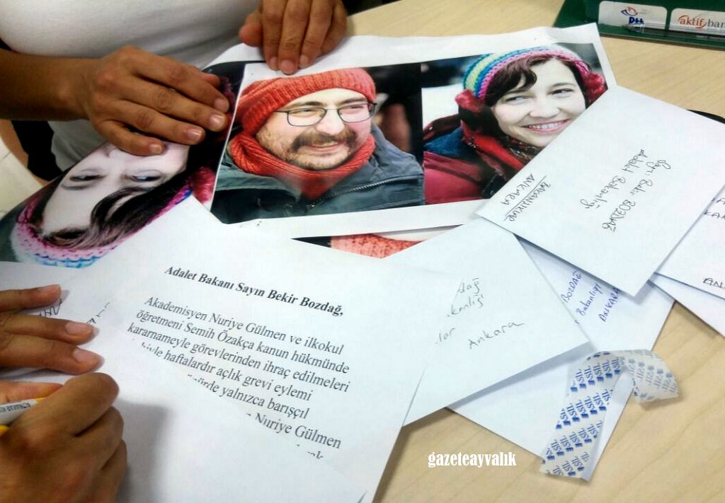 Bir gün önce Gezi Parkından gökyüzüne balon uçurarak, KHK ile ihraç edildikleri görevlerine geri dönmek için açlık grevi yapan akademisyen Nuriye Gülmen ve Semih Özakça’ya Ayvalık’tan destek veren Ayvalık Emek ve Demokrasi Güçleri bu kez Gülmen ve Özakça’ya Ayvalık fotoğraflarının yer aldığı kartpostallar gönderdi.