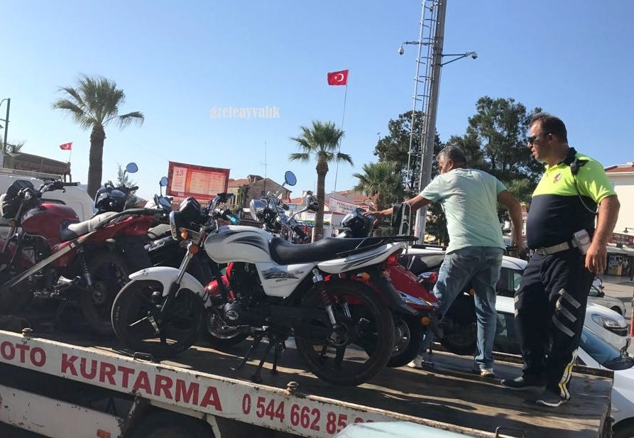 Ayvalık Emniyet Müdürlüğü Trafik Şube ekipleri, Barbaros ve Talatpaşa Caddelerinde motor uygulaması yaptı. Uygulamada, plakasız ve ehliyetsiz kullanılan motosikletler toplanırken, 6 tescilsiz motosiklet trafikten men edildi.