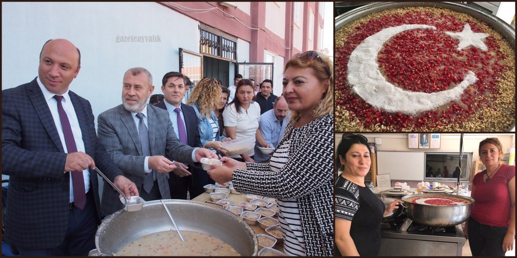 Öğrencilere gelenekleri hatırlatmak ve değerleri yaşatmak adına 5 yıldır okul bahçesinde aşure hayrı düzenleyen Veli Tuncay yönetimindeki Ayvalık Anadolu Lisesi yönetimi, bu sene de öğrenci, öğretmen ve konuklarına aşure ikram etti. Bir hayırseverin desteği ile alınan malzemeler, AYAL Müdürü Veli Tuncay’ın eşi Zeynep Tuncay ve Pakmaya Kenan Kaptan Mesleki ve Teknik Anadolu Lisesi Müdürü Hüseyin Aday’ın eşi Aylin Aday tarafından pişirilip hazırlandı. 500 kişilik aşure üzerine nar, Hindistan cevizi ve fındık parçalarıyla yapılan Türk bayrağı motifi ile dikkat çekti. Aşure etkinliği İlçe Müftüsü Orhan Tosun’un yaptığı dua ile başladı. İlçe Milli Eğitim Müdürü Güner Bahadır, aşure dağıtımında Müftü Orhan Tosun ve Okul Müdürü Veli Tuncay’a yardım etti.