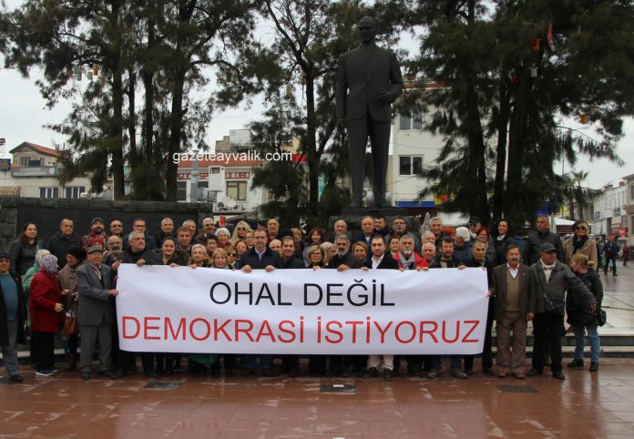 Ayvalık’ta CHP İlçe Başkanlığı tarafından yapılan Emek ve Demokrasi Güçlerinin destek verdiği açıklamada, OHAL’in kaldırılması istenerek, 18 aydan bu yana ülke rejimi olan OHAL’in bir karşı darbe halini aldığı belirtildi.