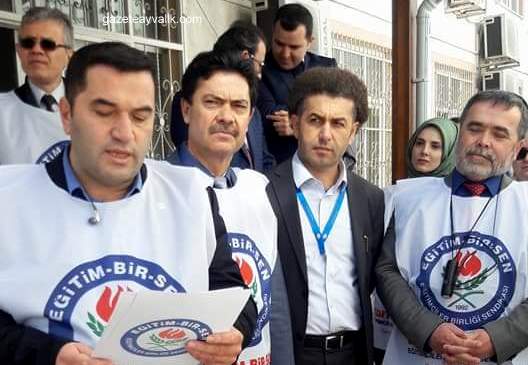 İlçe Milli Eğitim Müdürlüğü önünde 27 Mart Salı günü saat 12.15’te toplanan Eğitim Bir-Sen Ayvalık Temsilciliği yaptığı açıklamada, öğretmenlerin performanslarını değerlendirme sistemini eleştirdi. Temsilcilik Başkanı Mustafa Kurtuluş, “ Millî Eğitim Bakanlığı’nın, eğitimcilerin moral ve motivasyonunu bozacak, yüz yüze bakanları karşı karşıya getirecek, saygınlığını zedeleyecek performans değerlendirme sistemi taslağına ilişkin itirazlarımızı haykırmak; iş barışına halel getiren, vicdanları yaralayan, adalet duygusunu örseleyen mülakatla sözleşmeli öğretmen atama uygulamasına yönelik eleştirilerimizi dile getirmek; bazısı ölümle sonuçlanan şiddet olaylarını protesto etmek amacıyla bir araya gelmiş bulunmaktayız. Ekim 2017 tarihli Kurum İdari Kurulu Çalışma Raporu’nda “pilot illerde uygulaması denenmeye başlanılan, öğretmen motivasyonunu olumsuz etkileyecek, çalışma barışını bozacak, kanuni dayanağı olmayan öğretmenlerin performans değerlendirmesi uygulamasına son verilmesi” konusu üzerinde çalışma yapılması imza altında alınmasına rağmen böyle bir taslağın hazırlanması, söz konusu çalışmanın yapılmadığını, Bakanlığın, attığı imzanın gereğini yerine getirmekten imtina ettiğini göstermektedir. Taslak bir bütün olarak incelendiğinde, eğitimin niteliğine ve öğretmenin mesleki gelişimine hiçbir katkısının olmayacağı, aksine kurumsal bütünlüğü, mesleki motivasyonu, çalışma barışını ve iş birliğini zedeleyeceği, öğretmeni mesleğine odaklanmak yerine performans puanını yükseltme ve yazılı sınava hazırlanma eksenli bir çalışma hayatına yönlendireceği görülmektedir. Performansı ölçmek iddiasıyla öğretmenleri ayrıştıracak, kurumsal bütünlüğü, mesleki dayanışmayı, iş birliği içinde çalışma güdüsünü zedeleyecek bir uygulamanın eğitimin var olan niteliğine de bir darbe vuracağı hesaba katılmalıdır” dedi.