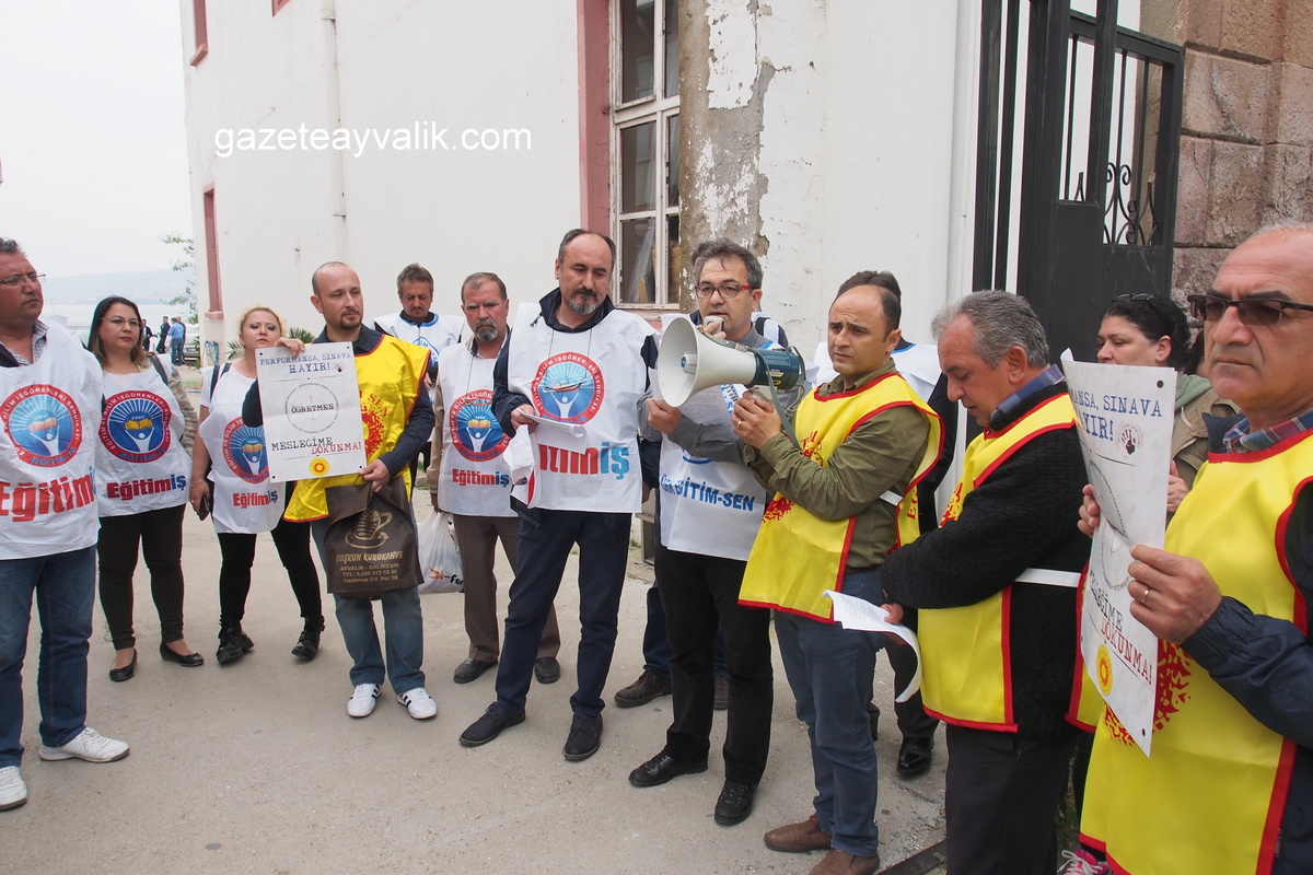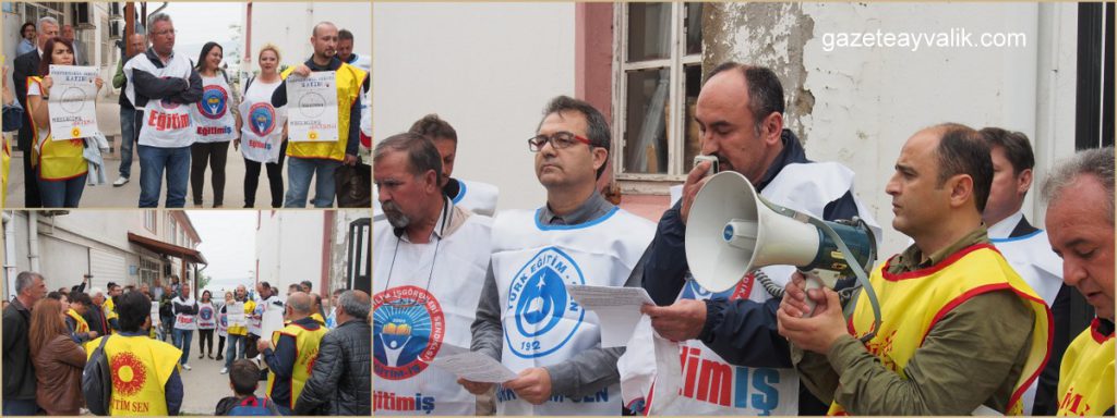 Eğitimde performans değerlendirmesine tepki gösteren Eğitim-Sen, Türk Eğitim-Sen ve Eğitim-İş Sendikası Ayvalık Temsilcilikleri, uygulamayı İlçe Milli Eğitim Müdürlüğü bahçesinde yaptıkları açıklama ile protesto etti.