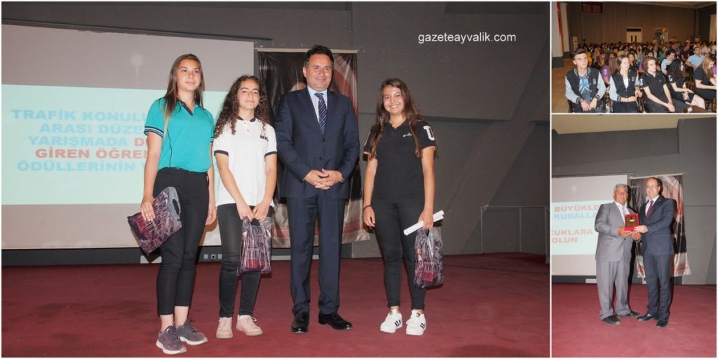 İsmet İnönü Kültür Merkezi’nde düzenlenen programda trafik kurallarını anlatan sinevizyon gösterimleri yapıldı. Bu yıl ‘Hey büyükler, Trafik kurallarına uyun. Biz çocuklara örnek olun’ sloganıyla gerçekleştirilen Trafik haftası kapsamında yapılan kompozisyon yarışmasında dereceye giren Uğur Anadolu Lisesi öğrencisi Sümeyra Yılmaz, Ayvalık Anadolu Lisesi öğrencisi Merve Deniz ve Rahim Usta Anadolu Lisesi öğrencisi Serenay Körükçü’ye ödülleri verildi.