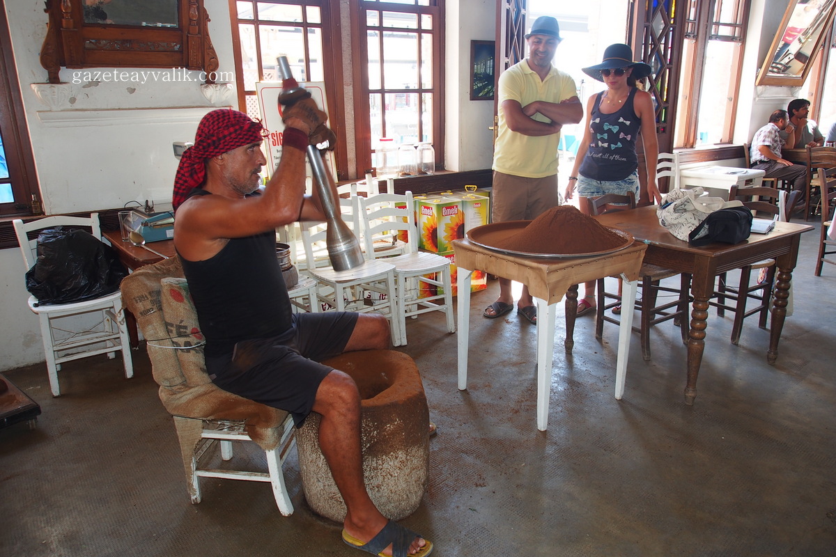 Cunda Adası’nda, taş havandan çıkan sesi merak eden tatilciler, dibek kahvesi hazırlayan Ferit Toprak’ı ilgiyle izliyor. Kimi vatandaş hatıra fotoğrafı çektirirken, kimi vatandaş ise nasıl yapıldığı hakkında bilgi aldığı dibek kahvesini 20 kiloluk tokmakla dövmeyi de deniyor.