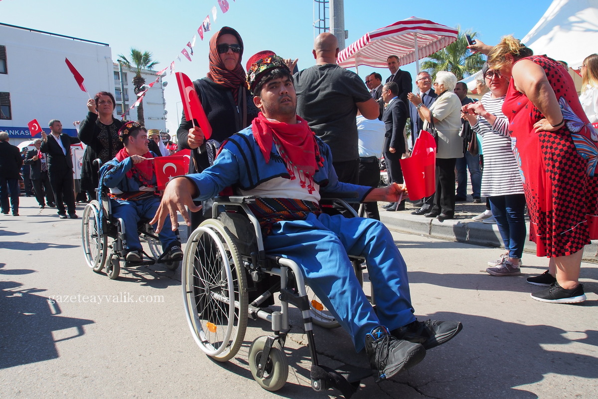 Türkiye Sakatlar Konfederasyonu başkanı Yusuf Çelebi, “Bir bütün olduğumuzu, tek farkımız belki bir organımızın işlememesidir. Diğer insanlardan hiçbir farkımız olmadığını ifade etmek istiyorum. Sayın Cumhurbaşkanımızın söylediği gibi engellilerimiz sadaka kültürü değil hak ekseninde taleplerimiz var. 2005 yıllarında engellilerle ilgili kanunla ilgili erişilebilirliğin bir an önce çözülmesi gerekmektedir. Kanun var, yönetmelikler var. Yetkililere sesleniyoruz, engellilerin önündeki engelleri kaldırınız diyoruz. Dört duvar arasında yaşamak istemiyoruz. İstihdamlar gerçekleşiyor. Artık ne iş verirseniz değil eğitimimizle ilgili savcı olmak, kaymakam olmak, vali olmak, bakan olmak istiyoruz” dedi. Konuşmaların ardından Ayvalık Belediyesi Özel Çocuklar Eğitim Evi öğrencileri, zeytin çekirdeklerinden hazırladıkları, İçinde Mustafa Kemal Atatürk’ün resmi bulunan çerçeveyi Balıkesir Valisi Ersin Yazıcı’ya hediye etti. Tören, şenliğe katılan tüm dernekler, engelliler ve ailelerinin korteji ile sonra erdi.