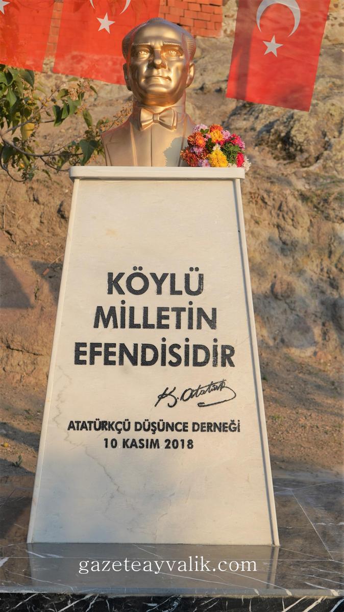 Atatürkçü Düşünce Derneği Ayvalık Şube Başkanı Ahmet Üzgeç, büstün yapılmasında emeği geçenlere teşekkür edip, “Büstü yaparak büyük önder Atatürk’ü putlaştırmadık. Aksine onun düşüncelerini gündeme taşımayı amaçladık. Emperyalizmi, tarihte ilk kez yenilgiye uğratan, Türkiye Cumhuriyeti’nin Kurucusu Gazi Mustafa Kemal Atatürk’ü, bedenen aramızdan ayrılışının 80. yıl dönümünde asla tükenmeyecek özlem, saygı ve bağlılıkla anıyoruz. Mustafa Kemal Atatürk, tüm dünyanın saygı duyduğu gerçek anlamda bir dünya lideridir. Mustafa Kemal Atatürk, emperyal kuvvetlerin karşısında büyük zaferler kazanan eşsiz bir kahraman ve bir antiemperyalist liderdir. Düşmanları bile O’nun önünde saygıyla eğilmektedir. Mustafa Kemal Atatürk, Türk Ulusunu çağdaş dünyayla buluşturan kazanımlarıyla, yaratıcısı olduğu Türk Devrimi ile büyük bir bilge ve dâhidir. Mustafa Kemal Atatürk, Kurtuluş Savaşı’ndaki liderliğiyle; planlayıcısı ve uygulayıcısı olduğu Cumhuriyet Devrimi ile tüm mazlum uluslara önderlik yapmış evrensel bir kişiliktir. Mustafa Kemal Atatürk, “egemenlik kayıtsız şartsız milletindir” diyerek; ulus egemenliğini hâkim kılmış, laiklik ilkesiyle de demokratik bir toplumun temelini atmıştır. Emperyalizmle savaşın en hararetli anlarında bile kurucusu olduğu TBMM’ ni açık tutarak ve çalıştırarak millet iradesini kurtuluşun kaynağı haline getirmiştir. Türkiye Cumhuriyeti’nin demokratik, laik, sosyal, hukuk devleti nitelikleri Atatürk’le hayatiyet kazanmıştır.”