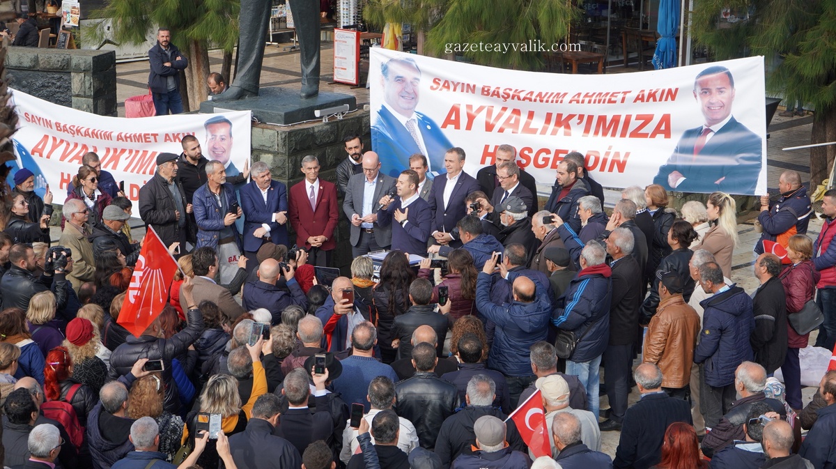 CHP İl Başkanı Serkan Sarı ve Ayvalık Belediye Başkanı Rahmi Gençer ile birlikte Ayvalık Cumhuriyet Meydanı’na CHP Otobüsünde gelen Ahmet Akın, Belediye Başkan Yardımcısı Gökay Bacan, Belediye Meclis üyeleri, CHP ilçe Başkanı Hüseyin Şalmanlı, CHP ilçe yönetimi, Ayvalık Belediye Başkan aday adayları Mesut Ergin ve Ziya Eryavuz, Asım Sürer’in eşi Sevgi Sürer ve ekibi ile ilçedeki çeşitli sivil toplum örgütü temsilcileri, partililer ve çok sayıda vatandaş tarafından karşılandı.