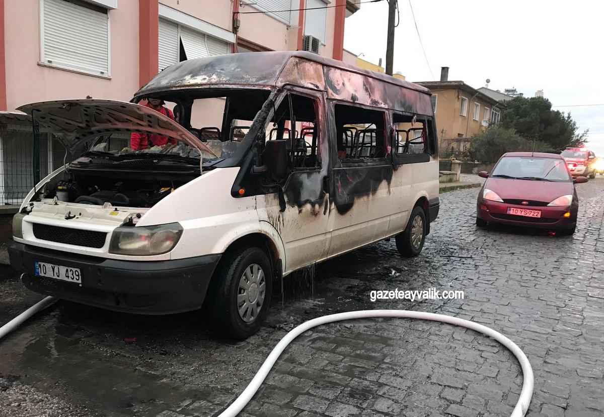 AYVALIK’TA SEYİR HALİNDEKİ MİNİBÜS YANDI