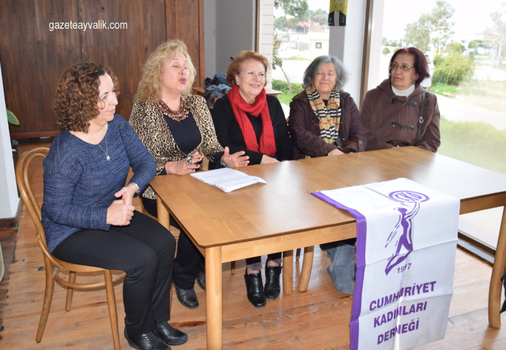 Türkiye’nin büyük bir ekonomik kriz içinde, tüketim toplumu halinde olduğuna dikkat çeken CKD Ayvalık Şube Yönetim Kurulu üyesi Vildan Aydemir, “Ekonomik krizin sıkıntıları, eğitim ve sağlıktaki gericileşme, Cumhuriyet değerlerinden kopuş, kadın ve çocukların hayatına şiddet, taciz, tecavüz, yokluk olarak geri dönmektedir.  Şiddete, gericiliği ve bölücülüğü yaratan emperyalizme karşı bütün kadınlar birlikte güç yaratarak karşı koyabiliriz.  Ülkemizin, emperyalizm tarafından içeride ve dışarıda saldırıya uğradığı, ateşle sınandığı bu zor günlerde kadınların farkındalığına birlik ve beraberliğine her zamankinden daha fazla gereksinim vardır. Yani şiddete karşı mücadele ancak örgütlü olmakla mümkündür. Bunun için, Vatan ve millet sevgisi taşıyan, Atatürk gibi zorluklarla yılmadan mücadele eden tüm kadınları Cumhuriyet Kadınları Derneği’ne üye olmaya Cumhuriyet devrimlerine sarılmaya davet ediyoruz” dedi.