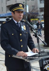 Sözlerine gerek yurt içinde gerekse sınır ötesinde devlet ve milletin bekası, vatanın bölünmez bütünlüğü için mücadele eden tüm güvenlik güçlerine selam, dua ve minnetlerini sunarak başlayan Ayvalık ilçe Emniyet Müdürü Turgut Coşkun, “Türk Polis Teşkilatı. Kurulduğu 1845 Yılından bu güne kadar edindiği tarihi birikim ile her geçen gün gelişerek ve kendini yenileyerek kamu düzeninin temini, toplumun huzur ve güvenliği, Vatandaşlarımızın Can ve mal emniyetini sağlama; hakkın teslimi ile Adaletin tecellisine katkıda bulunma gibi çok önemli görevler üstlenmiştir. Bu önemli görevleri icra eden teşkilatımız başta Anayasa ve bağlı kanunlardan aldığı yetki ve sorumluluk bilinciyle mesai mefhumu gözetmeksizin her hal ve şartta 7/24 Milletimize hizmet etmiş ve etmeye devam edecektir. Bu vesile ile, görevini özveriyle yapan tüm mesai arkadaşlarıma teşekkür ediyorum. Değerli Mesai Arkadaşlarım; icra ettiğimiz bu kutsal görevin bilinci ve sorumluluğu içinde, Güzel Yurdumuzun Cennet Köşesi, Turizm Şehri Ayvalık’ın aynı zamanda huzur şehri olarak kalması için değerli halkımızın desteği ile çalışmalarımıza aynı azim ve kararlılıkla devam edeceğimizden hiç kuşkum yoktur. Bu vesile ile görevini özveriyle yapan tüm Mesai arkadaşlarıma teşekkür ediyorum. Yürüttüğümüz bu onurlu görevde, en büyük destekçilerimiz olan Fedakâr Ailelerimiz ve Sevgili evlatlarımıza da gönülden en derin şükranlarımı sunuyorum” dedi.