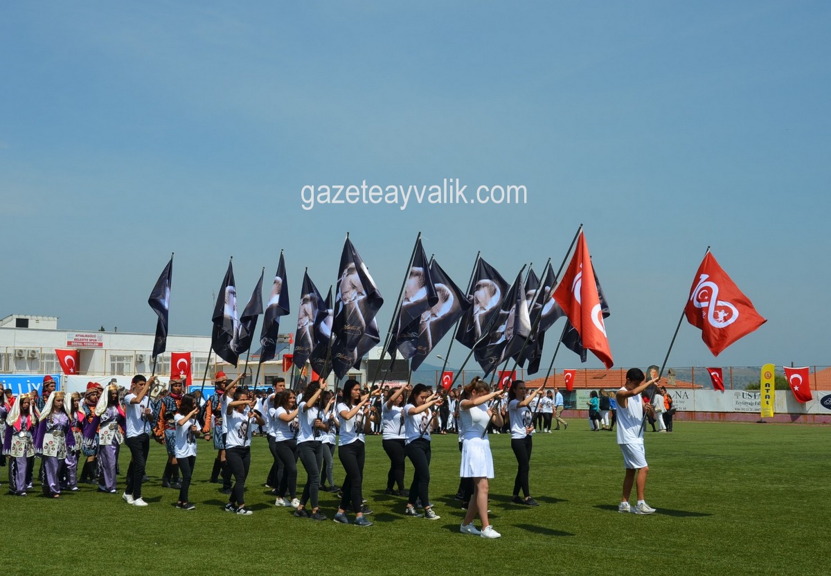 Törenin ikinci bölümü saat 10.30’da Hüsnü Uğural Stadyumunda düzenlendi. Kaymakam Gökhan Görgülüarslan, İlçe Garnizon Komutanı Albay Fevzi Koyuncu, Belediye Başkanı Mesut Ergin,  Ayvalık Gençlik Hizmetleri ve Spor Müdürü Emre Baydoğan,  kurum ve okul müdürleri, siyasi parti, meslek odası ve demokratik kitle örgütü temsilcileri, öğretmen, öğrenci ve vatandaşların katıldığı tören, saygı duruşu ve İstiklal Marşının okunması ile başladı. Ayvalık Atatürk Anadolu Lisesi tarafından hazırlanan programda, Rahim Usta Anadolu Lisesi öğrencisi Batuhan Arabacı şiir okudu. Ayvalık Anadolu Lisesi öğrencisi Emirhan Kocaoğlu ‘Ata’nın Gençliğe hitabı’, AYAL öğrencisi Erdinç Mert Teksin Gençliğin Ata’ya cevabını, Pakmaya Kenan Kaptan Mesleki ve Teknik Anadolu Lisesi öğrencisi Oğuzhan Bıdık şiir okudu.