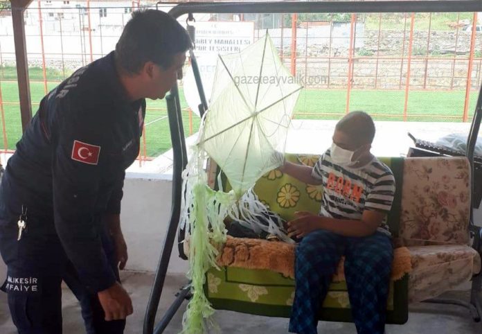 Ayvalık’ın Hamdibey Mahallesi’nde yaşayan lösemi hastası 14 yaşındaki Baran’ın elektrik tellerine takılan uçurtması Ayvalık İtfaiye Grup Amirliği ekiplerince alındı.