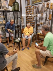 Geleneksel yaz tatili rotasına devam eden Rahmi Koç, her yıl ki tatil rotasında yer alan Ayvalık’ta, Antikacılar Çarşısını dolaştı. Kente her geldiğinde mutlaka uğradığı Antikacılar Çarşısı’nda ‘Dostum’ olarak nitelediği Giritli Antikanın sahibi Hakan Doğan ile sohbet eden Rahmi Koç, dükkândaki berber koleksiyonu, zeytincilik tarihi ve eski dükkân tabelaları koleksiyonunu beğendi.