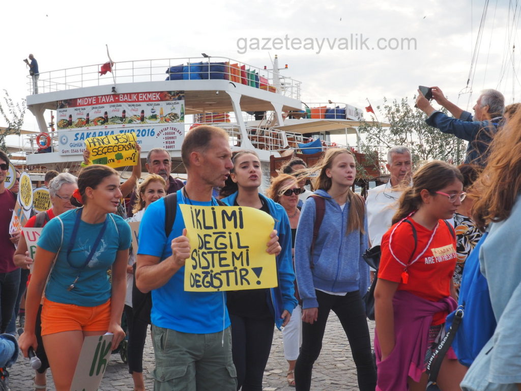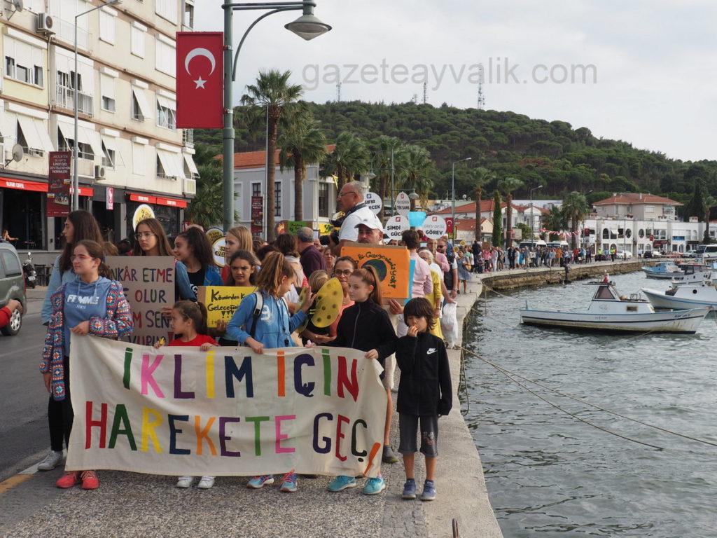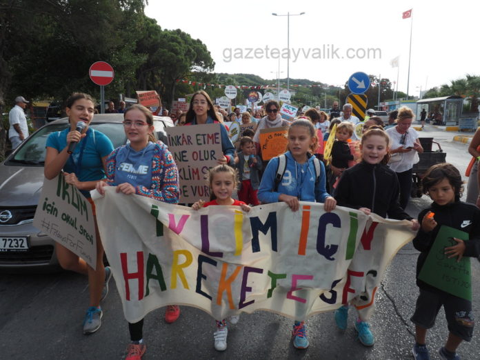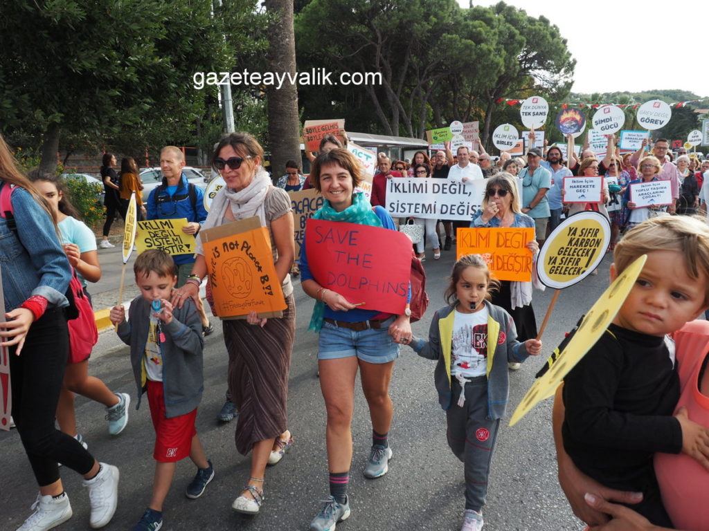 ‘Gelecek bizim, biz geleceğiz’, ‘Yerin altına bırak’, ‘Şirketleri değil doğayı koru’, ‘iklimi değil sistemi değiştir’ ‘Ne istiyoruz? iklim adaleti’, ne zaman istiyoruz? Şimdi’ sloganları eşliğinde Öğretmen Evi önünden başlayan yürüyüş Cumhuriyet Meydanı’nda tamamlandı. Ayvalık Belediyesi, Ayvalık Kent Konseyi, Ayvalık Tabiat Platformu, Burhaniye Çevre Platformu (BURÇEP), Kazdağı doğal ve kültürel varlıkları koruma derneği, Artur Çevre Platformu (Ar- Çep), Ayvelo Bisiklet Grubu, Ayvalık Voleybol Kulübü ve Zeytin Çekirdekleri temsilcilerinin yanı sıra çok sayıda vatandaşın katıldığı etkinlikte, düdükler çalarak tehlikeye dikkat çekildi. Cumhuriyet Meydanı’nda 10’dan geriye doğru sayma işlemini ‘ Sıfır Karbon’ diyerek bitiren çocuklara, Zeytin Çekirdekleri Korosu da şarkılarla destek verdi.