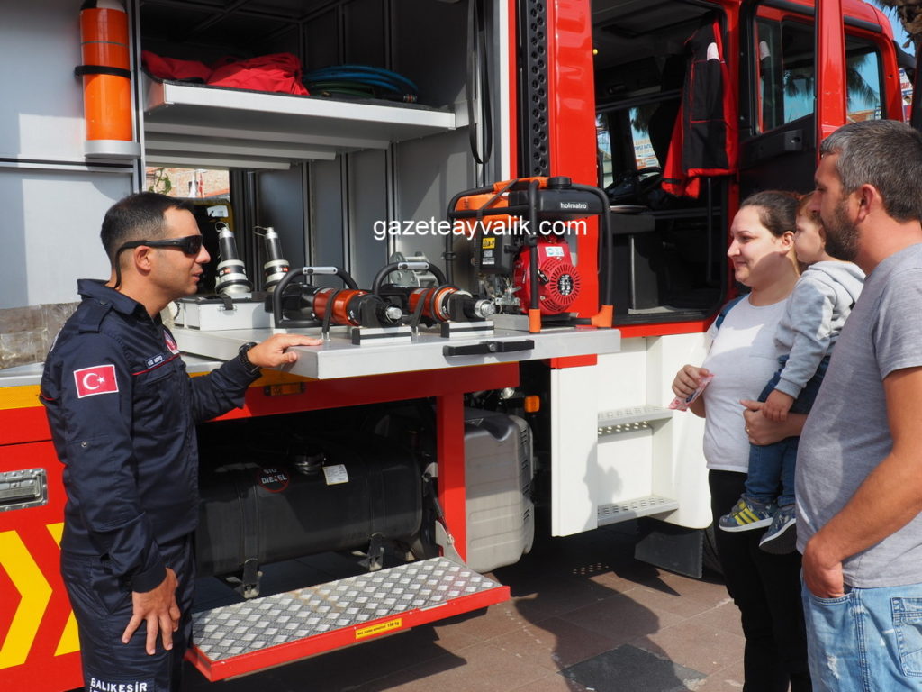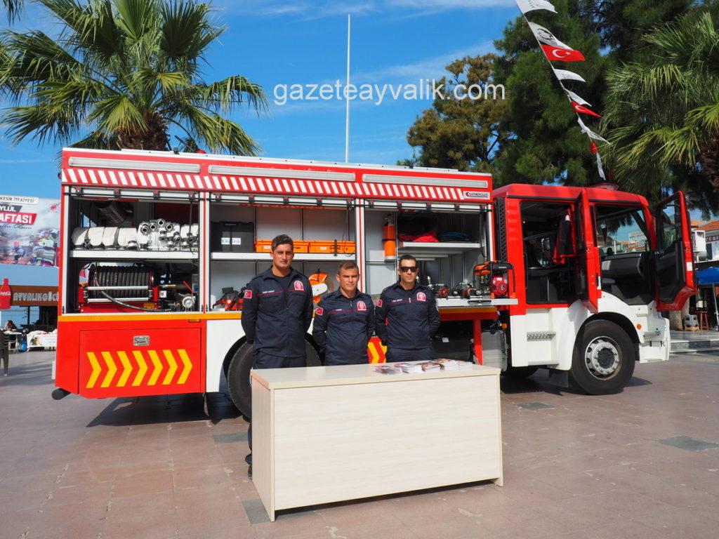İtfaiye Amiri Murat Turgut yönetiminde, 35’i Ayvalık, 9’u Küçükköy, 9’u Altınova, 6’sı Alibey (Cunda) müfrezesinde olmak üzere toplam 59 personelden oluşan Ayvalık İtfaiyesi Grup Amirliği, Cumhuriyet Meydanı’nda vatandaşlara bilgilendirici broşür dağıttı. Yangına müdahale ve kurtarma faaliyetlerinde kullanılan makine ve teçhizatlar gösterilerek bilgi verildi. 2 adet 24 metre 1 adet 18 metre merdivenli araç, 3 adet ilk müdahale aracı, 1 adet hızlı müdahale aracı, 1 adet kurtarma aracı, 2 adet su ikmal aracı, sualtı üstü kurtarmalarda kullanmak için 1 adet zodyak bot 2 adet jet ski ile 7/24 görev başında olduklarını ifade eden İtfaiye amiri Murat Turgut, “Hafta nedeniyle, öğrencilere yangının zararları anlatıldı, yangından korunma yolları ve alınması gereken önlemler belirtildi. İtfaiyeciler olarak, vatandaşlarımızın can ve mal güvenliğini korumak ve onlara yardımda bulunmak için varız. Ayvalık’ta 24/48 olarak ama 7/24 hizmet veriyoruz. Afetler, depremler, yangınların yanı sıra kazalar ve kurtarma çalışmalarında da 112 ihbar hattı aracılığıyla çalışarak gerektiği her anda göreve hazırız. Biz hazırız ama yine de kazaların, yangınların az olmasını diliyor, böyle olması içinde gerekli tedbirleri alıyoruz.