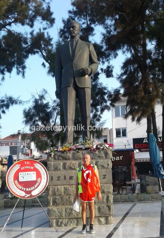 Ayvalık’ın Altınova Mahallesinde yaşayan ve yaklaşık 36 yıldır maraton koşularına katılan 69 yaşındaki Hasan Parlas, Cumhuriyet’in 96’ncı yıldönümü için 13 km koştu.