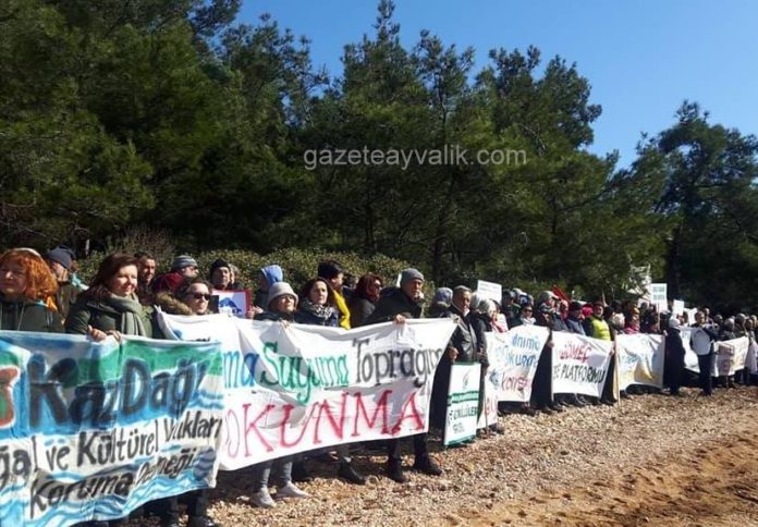 Tarım ve Orman Bakanlığı tarafından günü birlik kullanım alanı yapılması planlanan bölgede, ellerinde, ‘Doğa yaşamdır yok etmeyelim’, ‘Ayvalık Tabiat parkı ranta değil halka aittir’ ‘Ayvalık’a dokunma’ ‘Ayvalık Tabiat parkıyla güzel’ yazan döviz ve pankartlar taşıyan yaşam savunucuları, sahilde insan zinciri oluşturdu.