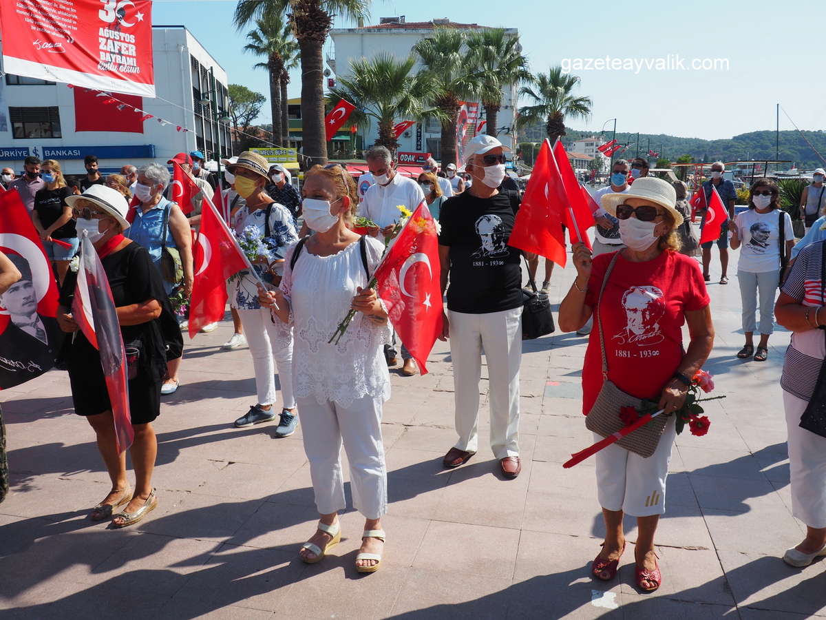 CHP Ayvalık İlçe Başkanı Hüseyin Şalmanlı, “Bugün; Asil Türk ulusu ve Kahraman Türk Ordusunun, ebedi Başkomutanı Ulu Önder Atatürk’ün önderliğinde, ulusu ile bütünleşerek 98 yıl önce gerçekleştirdiği büyük zaferi kutlamak için bir arada bulunuyoruz. Türk ulusunu var eden en onurlu günlerinden birisi olan yaşadığımız bugün, hem cephede hem de çağdaşlaşma yolunda verilen o büyük mücadeleyi ve o duyguları yeniden yaşıyoruz.Türk tarihi zaferlerle doludur. Ancak 30 Ağustos 1922’de zaferle sonuçlanan Büyük Taarruz, Türk ulusunun yeniden dirilişidir. Her safhası tek tek düşünülerek hazırlanan bu zafer, aziz yurduna ve bağımsızlığına kasteden işgal kuvvetleri karşısında Türk Ordusu’nun ortaya koyduğu eşsiz bir eserdir. Emperyalist devletler Sevr antlaşması ile topraklarımızı aralarında paylaşmış, Türk Milletini vatansız bırakmayı amaçlamışlardı. Ancak, asırlardır hür yaşamış olan Türk ulusu, buna karşı çıkmıştır. Anadolu halkı tek bir yumruk olarak, dış ve iç odakların ihanetleri karşısında ve yokluklar içerisinde büyük fedakârlıklarla verdiği Kurtuluş Savaşı’nda, en son Başkomutanlık Meydan Muharebesini de kazanarak kesin zafere ulaşmıştır. “Ya İstiklal Ya Ölüm” parolası ile başlayan bu muharebede elde edilen zafer, Türk’ün bağrına dayanan hançerin Ulus’ça sökülmesi, ve haysiyetimizi yok etmek isteyenlerin dize getirilmesinin destanıdır. Büyük Kahraman ve eşsiz Zafer adamı büyük Atatürk, bu muharebelerin önemini şöyle ifade etmiştir. “Afyonkarahisar-Dumlupınar Meydan Muharebesi ve onun son safhası olan 30 Ağustos Muharebesi… Türk tarihinin en önemli bir dönüm noktasıdır. Yeni Türk devletinin, genç Türk Cumhuriyeti’nin temelini orada attık. Sonsuz hayatını orada taçlandırdık. O sahada akan Türk kanları, semasında uçan şehit ruhları devlet ve Cumhuriyetimizin sonsuza kadar muhafızlarıdır.” İşte 30 Ağustos 1922 tarihi, Türk ulusunu esir etmek isteyen emperyalist güçlere karşı; kadınıyla çocuğuyla, ordusuyla topyekûn verdiği bir savaşın Zafer Destanı’nın yazıldığı gündür. Bu mutlu günde, zaferi bize yaşatan başta Türkiye Cumhuriyetinin kurucusu Büyük Önder Atatürk ve silah arkadaşları olmak üzere, Kurtuluş Savaşının tüm kahramanlarını, mukaddes vatanımız için canları pahasına görev yapan şehitlerimizi, gazilerimizi saygı ve rahmetle anıyoruz. Aziz ulusumuzun Zafer Bayramı kutlu olsun.” dedi.
