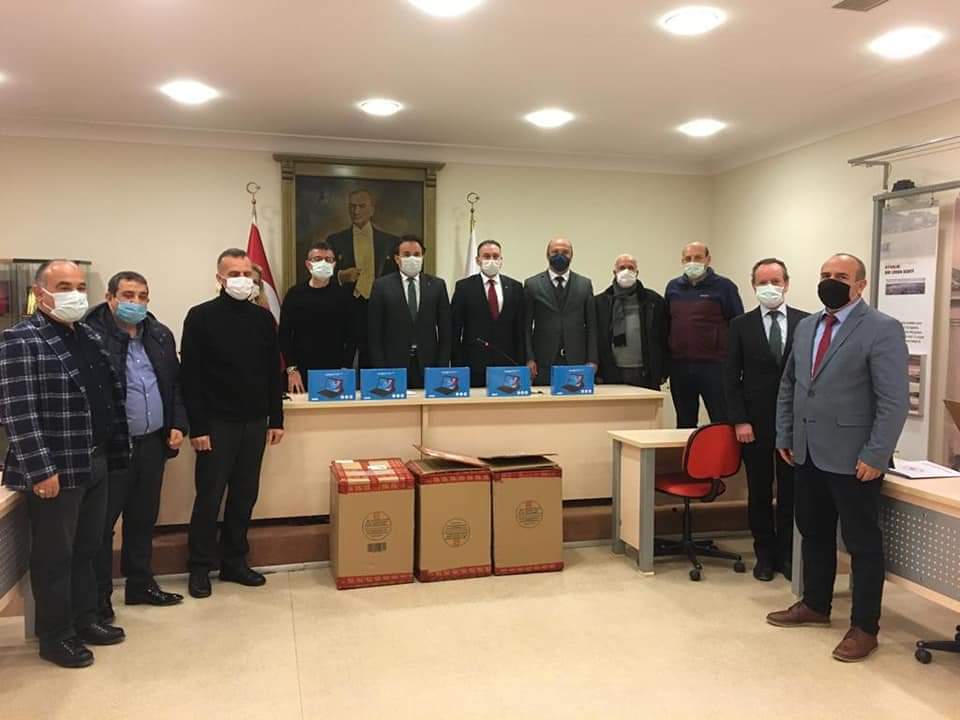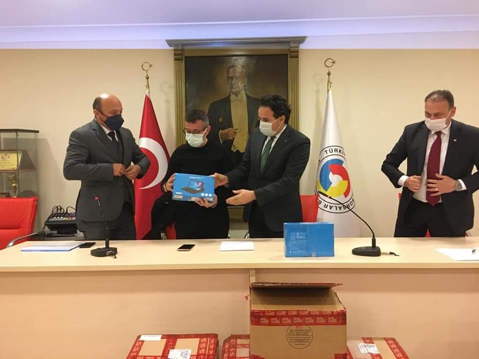 Ayvalık Ticaret Odası Salonunda, 16 Şubat günü düzenlenen teslim töreninde, Türkiye Odalar ve Borsalar Birliği (TOBB) ve Ayvalık Ticaret Odası meclis üyelerinin desteği ile alınan toplam 74 adet klavyeli tablet bilgisayar, Kaymakam Gökhan Görgülüarslan öncülüğünde öğrencilere dağıtılmak üzere Milli Eğitim Müdürü Güner Bahadır’a teslim edildi.