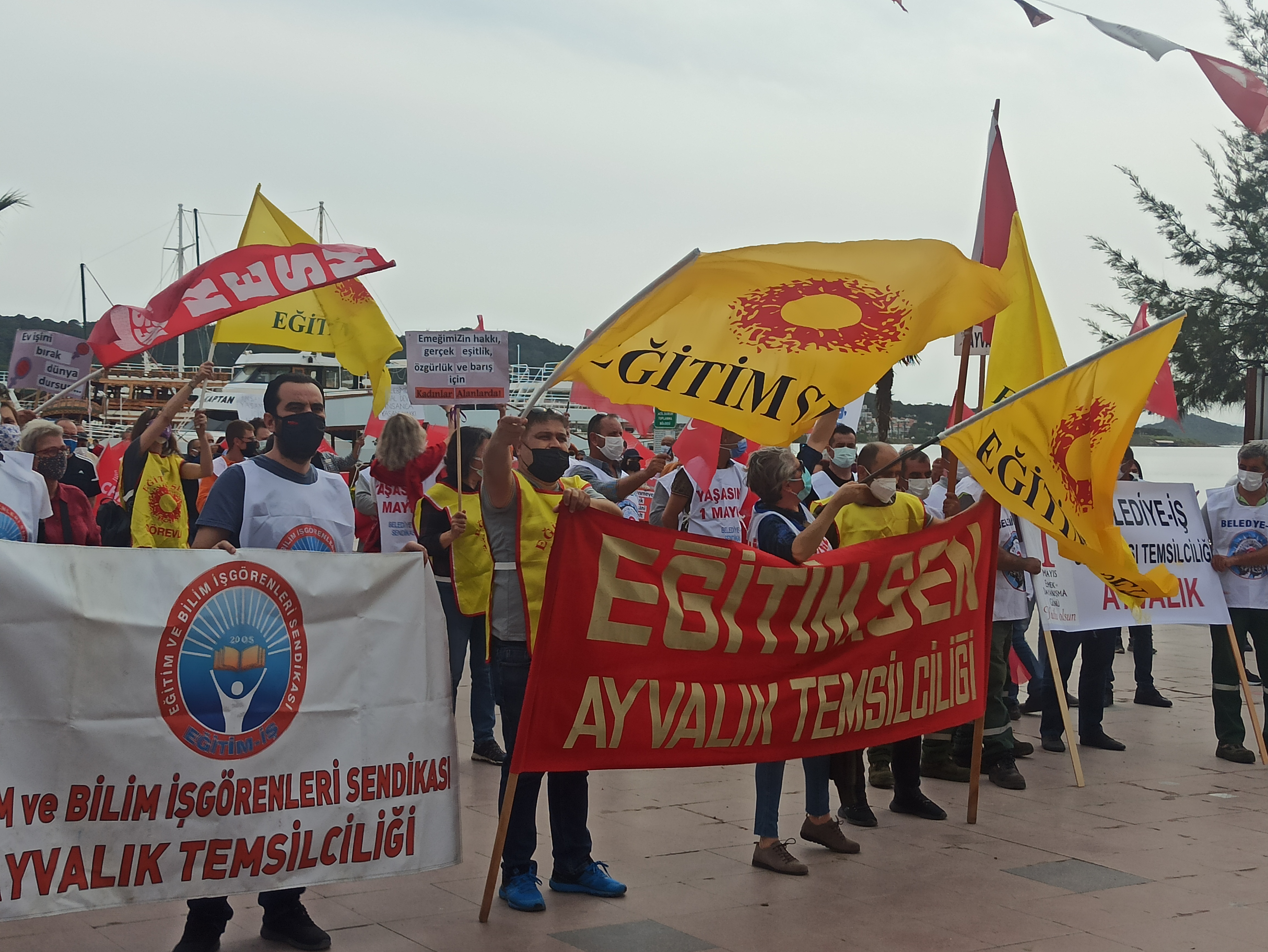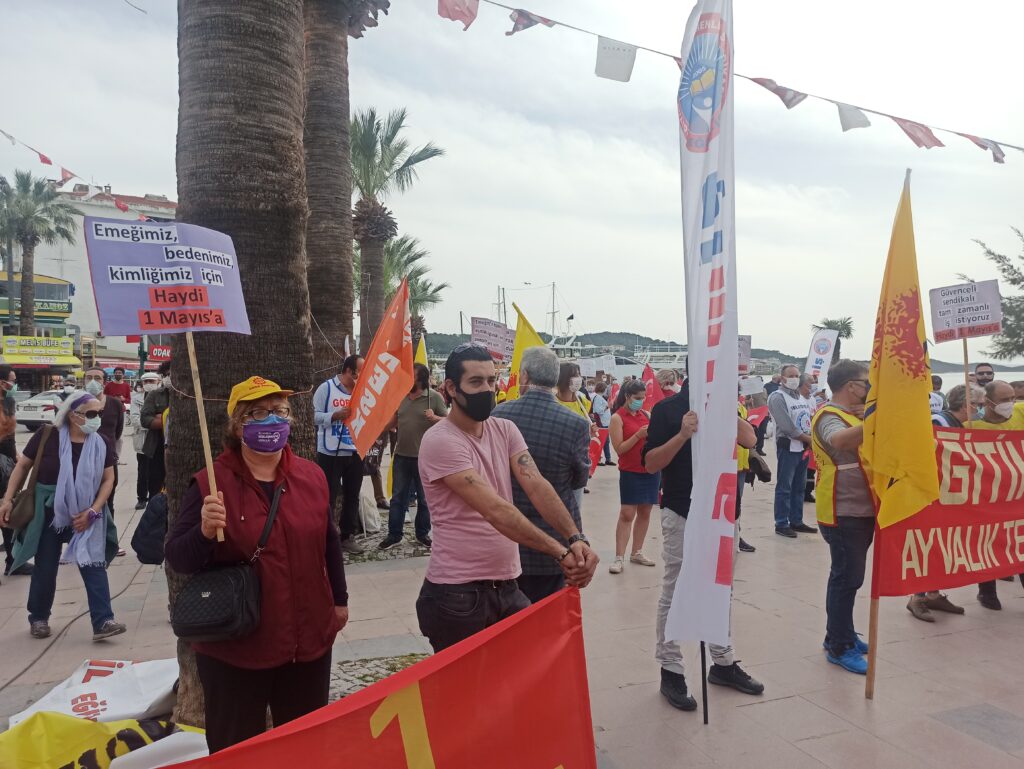 Usta Şair Nazım Hikmet dizeleriyle başlayan kutlamada, işçi ve emekçilerin küresel salgın şartlarında fedakarca çalışarak canlarını ortaya koyduğunu ifade eden Belediye -İş Sendikasından Didem Tığ, Ayvalık Demokrasi Platformu adına yaptığı konuşmada, ‘Emekçilerin yok sayıldığı, haklarının gasp edilmeye çalışıldığı, güvencesizliğe , işsizliğe ve sefalete mahkum edildiği bir dünyada ne salgınla mücadele edilebilir ne de hayat sürdürülebilir’ dedi.