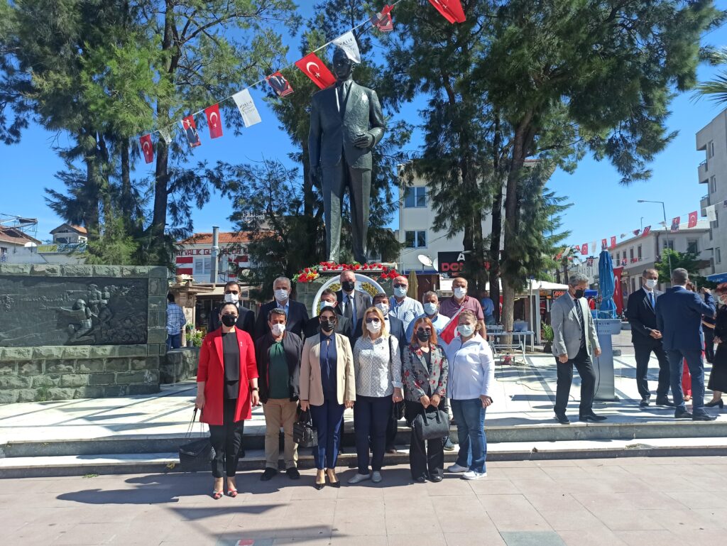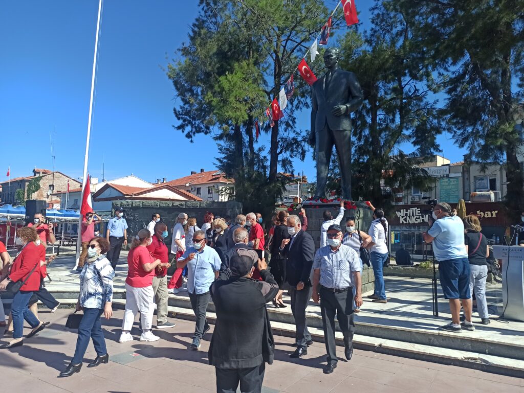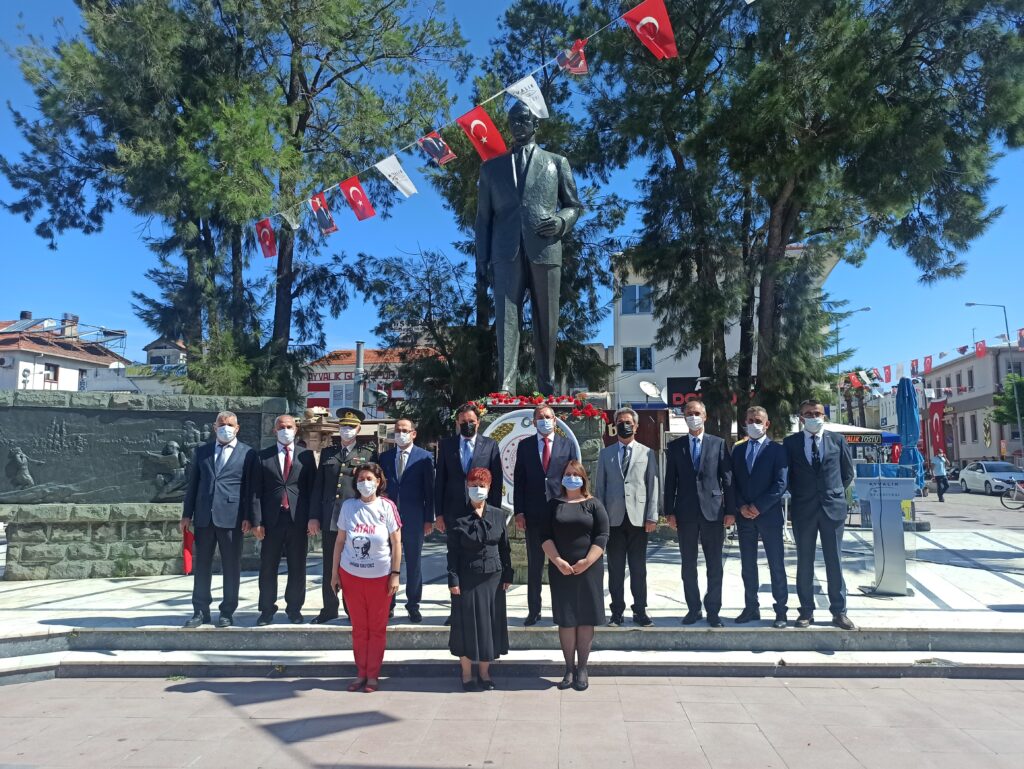 Anıtı çiçek bahçesine dönüştüren vatandaşlar, törene ellerinde bayraklarla eşlik etti. İlçe Gençlik Spor Müdürlüğü çelenk sunumunun ardından saygı duruşunda bulunuldu ve İstiklal Marşı okundu. ilçe Gençlik ve Spor Müdürü Şükrü Balkan, “Atatürk en büyük eserim dediği Türkiye Cumhuriyeti’ni Türk gençliğine emanet etmistir. Türk gençliği bugüne kadar olduğu gibi bundan sonra da Atasının emanetine, Cumhuriyet’ e sahip çıkacaktır. Çağdaş uygarlık seviyesinin üstüne çıkmak için üstüne düşen görevi yerine getirecektir.İyi eğitim almış, teknolojik kabiliyetlerine donatılmış Türk genci ülkemizi ileriye taşıyacaktır.” Dedi
