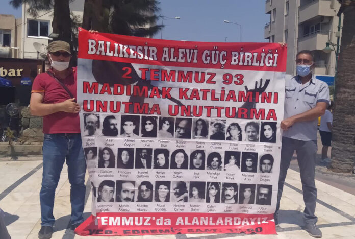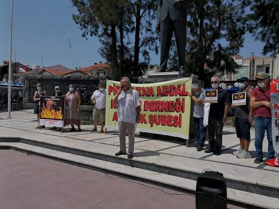 Ayvalık Demokrasi Güçleri, yerel yönetim, çeşitli STK’lar, siyasi partiler, sendikalar ve vatandaşların katıldığı anma etkinliğinde yaptığı konuşmada Ayvalık Pir Sultan Abdal Kültür Derneği Başkanı Vedat Tekten, “28 yıl önce Pirimiz Pir Sultan Abdal’ı anmak üzere Sivas’ta düzenlenen etkinlikler için ilimize gelen yazar, çizer, müzisyen, düşünür ve genç katılımcılarımız günler öncesinden başlatılan kışkırtmalar sonucu Madımak Otelinde kuşatılmış ve ikisi otel çalışanı 35 canımız bu gerici, katil sürüsü tarafından katledilmiştir. Bu katliam devlet güçlerinin gözü önünde, resmi kimlikli kişilerin yönlendirmeleriyle son derece planlı ve organizeli çalışmanın sonucunda gerçekleştirildi. Devlet, haftalar öncesinden başlayan ve kıyam çağrıları ile hedef gösterilen canlarımızı korumak için hiçbir önlem almadı. Adeta geliyorum diyen vahşete göz yumarak katil güruhunun toplanmasını ve kalabalıklaşmayı saatlerce seyretti. Gerici, faşist katiller, güvenlik güçlerinin gözü önünde resmi araçlar kullanarak yapılan anonslarla teşvik edilip yönlendirildiler. Önce kültür merkezine daha sonra da tekbirler ve nefret sloganları atarak ellerinde benzin bidonlarıyla otel önüne gelerek bu katliamı gerçekleştirdiler. Toplanma, kuşatma ve yürüyüş saatler boyu sürdü. Egemenlerin güdümündeki katliamcılar ayan beyan ortadaydı ve katiller hiçbir müdahale ile karşılaşmadan bu vahşeti gerçekleştirdiler. Böylesi bir insanlık suçu işleyen katil güruh içinden sadece çok küçük bir grup yakalanarak haklarında dava açıldı. Yıllar süren yargılamalar sonucu bu katillerin çoğu ya hiç ceza almadı ya da küçük cezalarla kurtuldular. Olayların perde arkasındaki düzenleyiciler asla açığa çıkarılmadı. Elebaşı konumundaki kişiler düzmece gerekçelerle affedildiler. Haklarında dava açılan bir kısım katil ne hikmetse bulunamadı. Katillerin bazıları Sivas’ta hiç ayrılmadan yaşamlarına devam ettiler.
