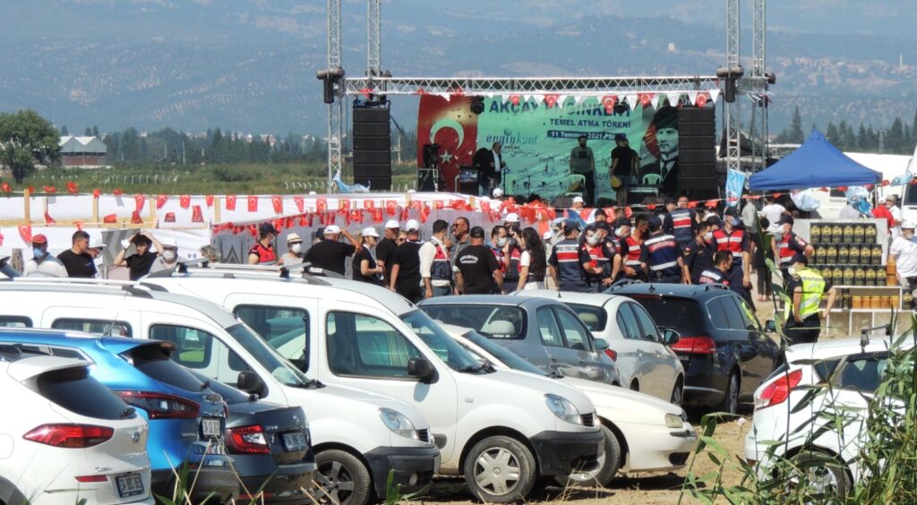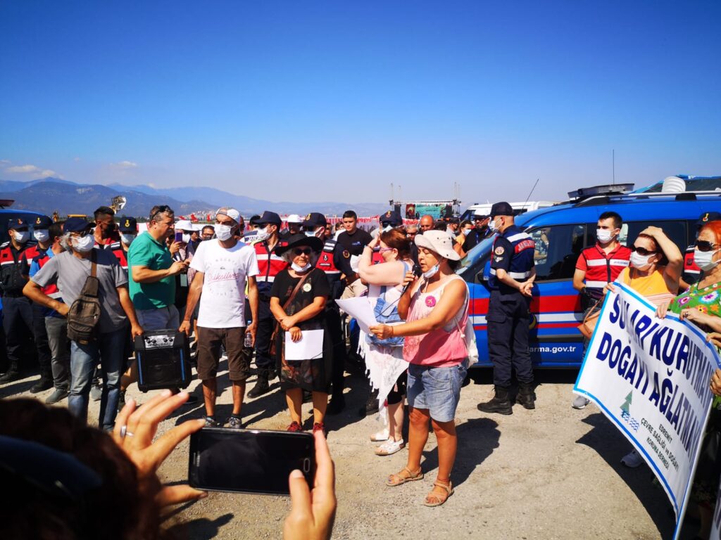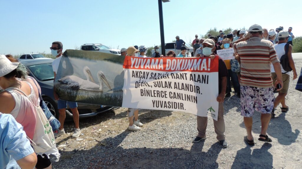 Geniş güvenlik önlemlerinin alındığı alana doğru “Akçay Sazlığı Rant Alanı Değildir, Sulak Alandır. Binlerce Canlının Yuvasıdır. Yuvama Dokunma” yazılı pankart ve dövizlerle “İmar Rantına Hayır”, “Sulak Alan Bizimdir, Bizim Kalacak” şeklinde sloganları atan yaşam savunucuları tören alanına sokulmadı.Yaşam savunucularının basın açıklamasını engellemek için temel atma alanındaki ses sistemi sonuna dek açıldı.Bunun üzerine, ıslıklarla ve “Müziği Kes” sloganları ile protesto edilen şirket, avukatların ve güvenlik kuvvetlerinin devreye girmesi ile ses sistemini kapatmak zorunda kaldı. Konuya ilişkin yapılan açıklamada şu görüş ve düşünceler dile getirildi.