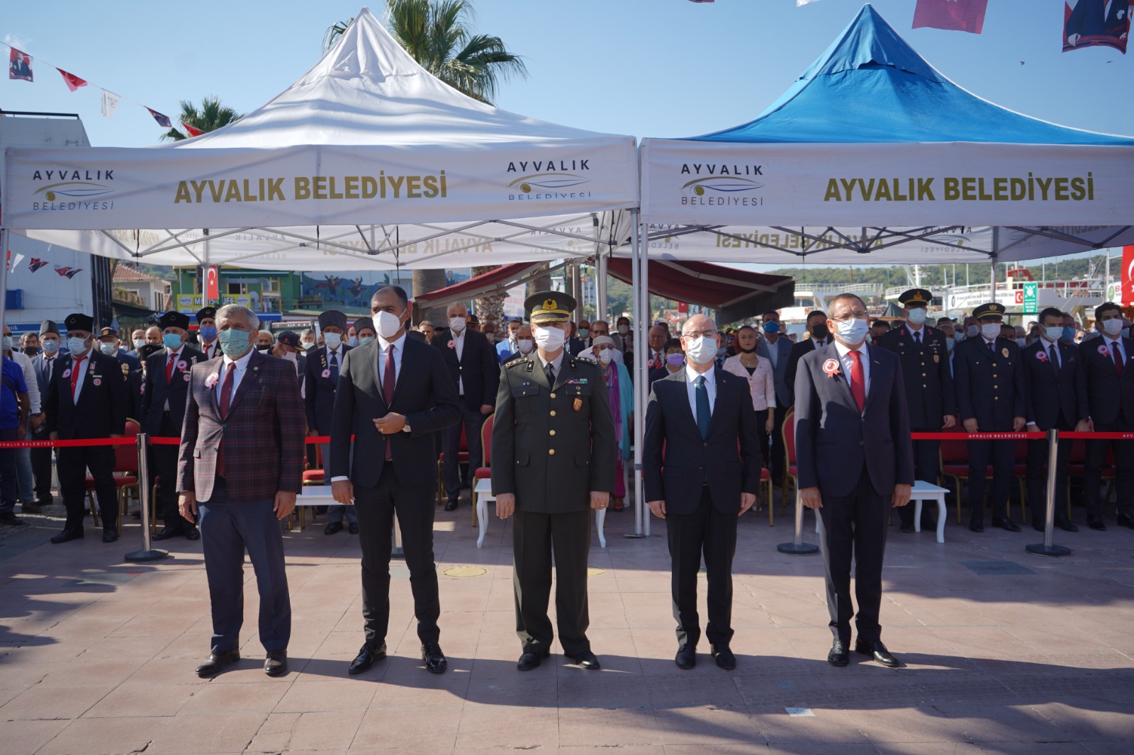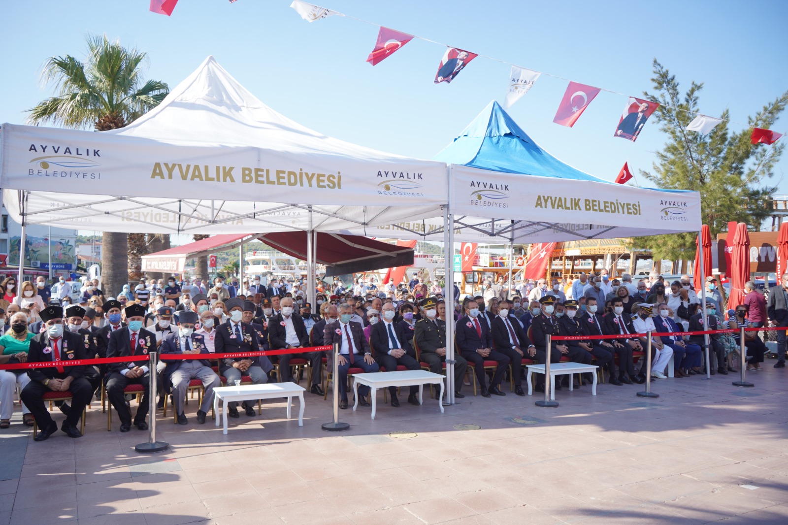 Saat 10.00’da başlayan törenlerde Kaymakamlık, İlçe Garnizon Komutanlığı ve Belediye Başkanlığı tarafından Atatürk anıtına çelenk sunumu yapıldı. Çelenk sunumunun ardından Ayvalıklılar Atatürk Anıtına çiçek bıraktı. 1 dakikalık saygı duruşunun ardından askeri bando eşliğinde İstiklal Marşı söylendi.