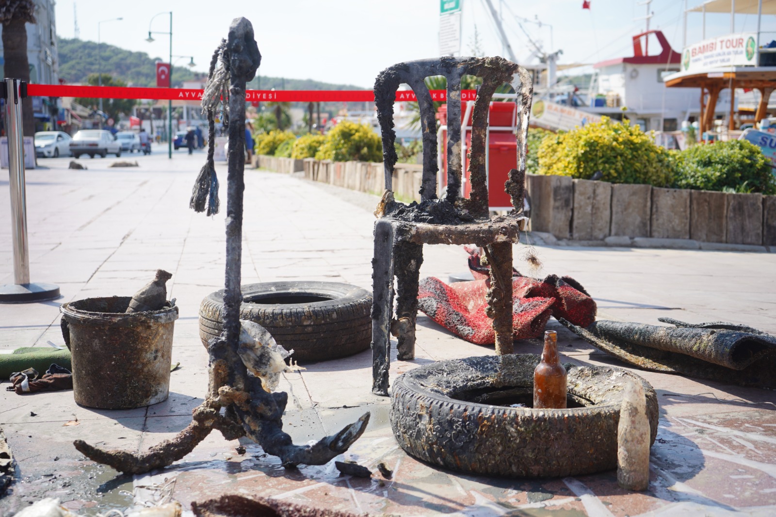 Ayvalık İç limanında 8 dalgıcın katılımıyla yapılan deniz dibi temizliği, denizdeki kirliliğin boyutu ve etkilerini gözler önüne serdi. 2.5 saat süren temizlik sırasında denizden çıkarılanlar kıyıda sergilendi.