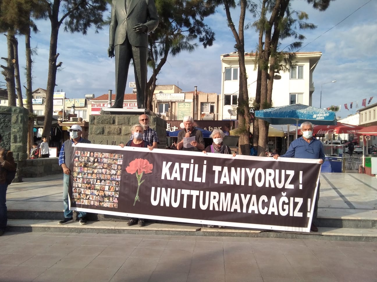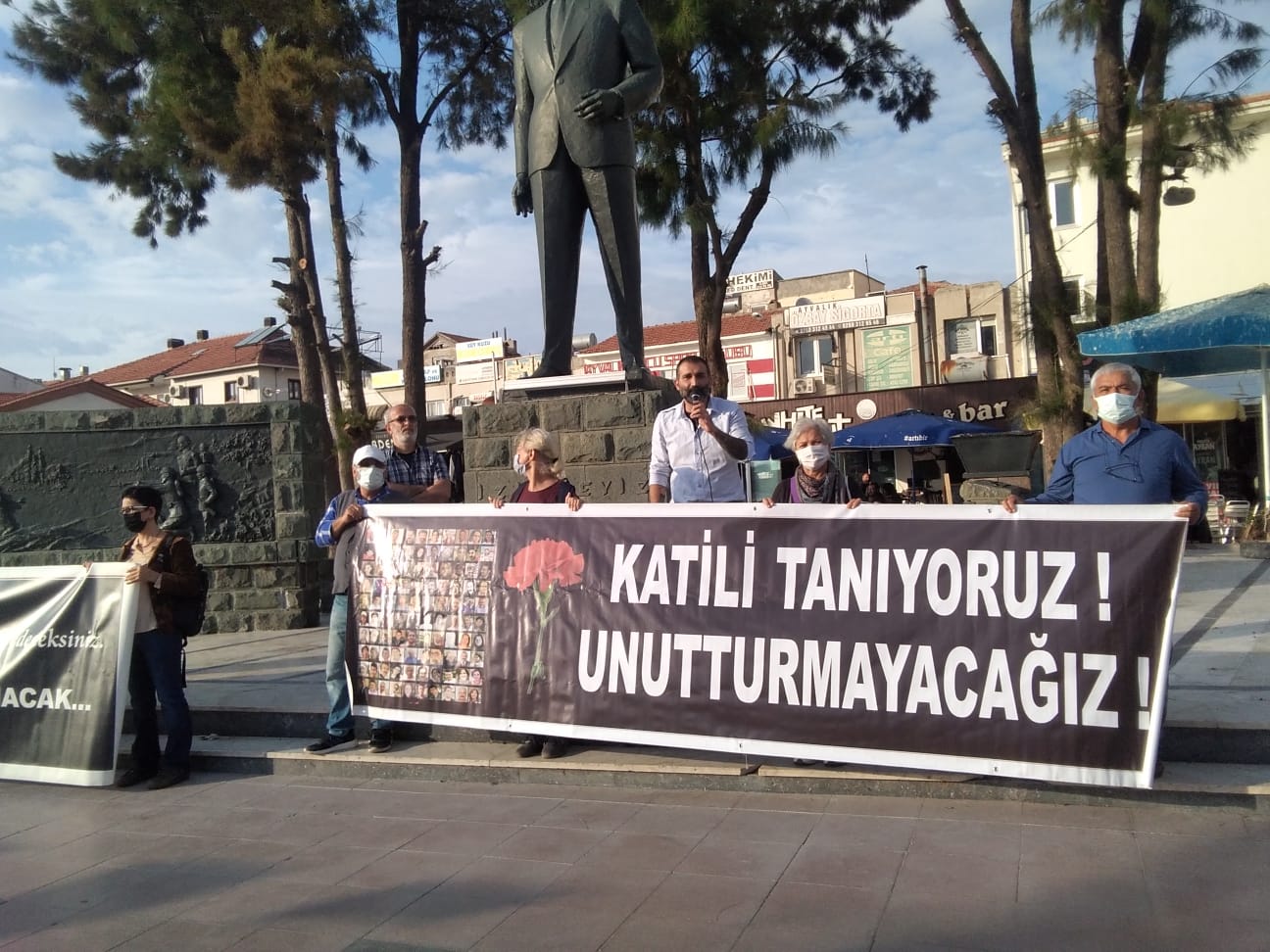 “Ceza dosyası kapsamında dosyaya katılanlar olarak bizlerin talepleri ile damla damla kazandırılan deliller ile artık hepimiz biliyoruz ki; bugün 6. Yıl anmasını yaptığımız, devasa acılara karşılık gelen bu katliam önlenebilirdi. İki seçim arasında, 2015 yılının karanlık bir dönemine tekabül eden 10 Ekim Ankara Katliamı siyasi bir cinayettir. Yakın tarihimizin en karanlık döneminin aydınlığa kavuşması için siyasetçileri de ellerine vicdanlarına koymaya, gerçekleri açıklığa kavuşturmaya çağırıyoruz: Türkiye’nin barış umuduna darbe vuran, insanları sokağa çıkamaz hale getiren 7 Haziran ile 1 Kasım 2015 seçimleri arasında yaşanan olayların sorumlusu kimdir? Bizim çocuklarımız neden öldürüldü? Bilinmelidir ki, insanlığa karşı işlenen bu suçların faillerini gizleyenler, bu suçların ortağıdır. İktidarını korumak için toplumu kaos ve şiddet sarmalına sürükleyenleri asla unutmayacağız. Kardeşlerimizin hayatlarından, bizlerin acılarından oy devşirenleri asla affetmeyeceğiz. Bildiğiniz gibi, 10 Ekim katliamı, kendinden önce aydınlatılmamış 5 Haziran 2015 Diyarbakır ve 20 Temmuz 2015 Suruç katliamları gerçek anlamda araştırılsa ve failleri bulunsaydı hiç yaşanmayacaktı. Kamusal sorumluluğun katliamlardaki yerinin ortaya koyulabilmesi, “devletin hizmet kusuru” olduğunun bir mahkeme kararında geçebilmesi adına açmış olduğumuz tam yargı davalarının pek çoğunda artık Danıştay aşamasına gelinmiş bulunmaktadır. 2021 yılı Temmuz ayında Danıştay tarafından verilen, devletin bu katliamlardan dolayı “kusursuz” olduğu ve ölenlerin, yaralananların kusurlu ve borçlu çıkarıldığına dair kararı, katliamın 6. Yılında vicdanları yaralamaktadır. İlk derece mahkemelerde açık ve bariz kamusal kusura işaret edilirken üst mahkeme süreçlerinde devletin sosyal risk sorumluluğundan dahi bahsedilmemesi büyük bir çelişki ve sorundur. Elbette ki, verilen her yanlış ve hatalı karara karşı bu ülkenin iç hukuk yollarını tüketmek amacıyla her türlü hukuki başvuruyu yapmış bulunmaktayız. Eşitlik, özgürlük, demokrasi ve barış mücadelesi yitirdiğimiz arkadaşlarımızın en büyük emanetidir. Bizler bugüne kadar olduğu gibi bundan sonra da bu doğrultuda kararlı mücadelemizi sürdürmeye devam edeceğiz. Katliamın 6.yılında, bombaların patladığı acı dolu olayı Ayvalık’tan bir kez daha sesleniyoruz: Kaybettiklerimizi unutmayacağız, unutturmayacağız! Sorumlularını unutmayacağız, affetmeyeceğiz! Yaşasın Emek, Barış ve Demokrasi Mücadelemiz.” Denildi.
