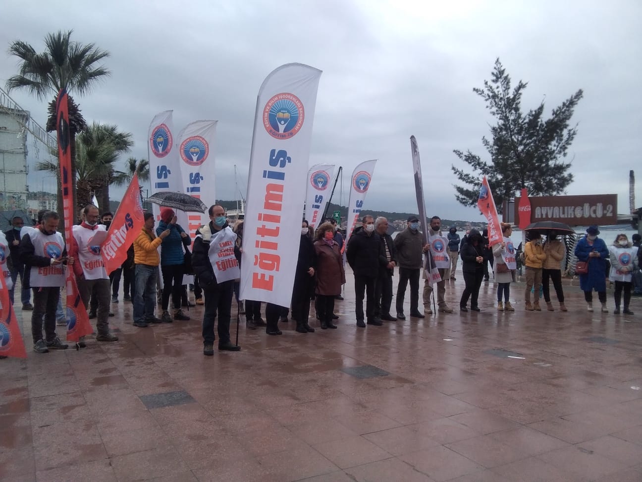 Eğitim-İş Sendikası’nın bugün için çağrı yaptığı bir günlük iş bırakma eylemleri yurdun birçok yerinde gerçekleştirildi. Ayvalık’ta Cumhuriyet Meydanında bir araya gelen Eğitim-İş Ayvalık Temsilciliği, “Kısık sesle şartlardan değil gür sesimizle alanlardan haykırıyoruz” dedi.