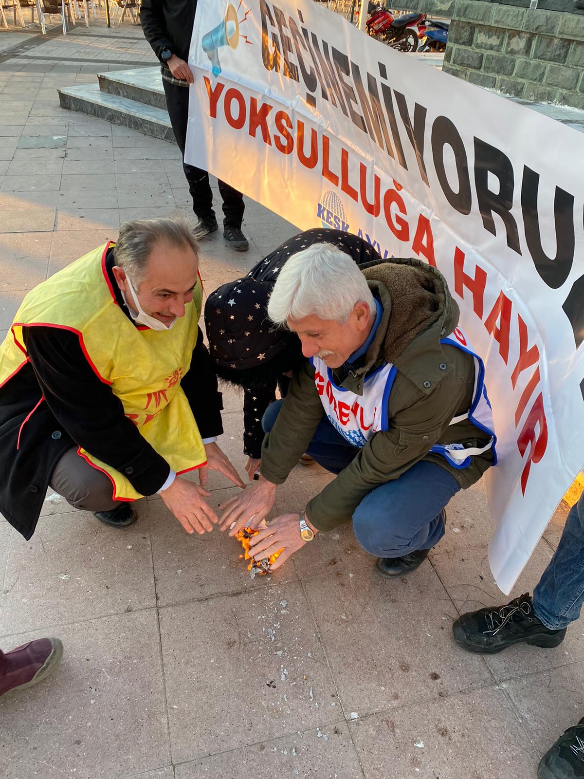 Üstümüze çöken bu zifiri karanlıktan tek çıkış yolumuz hangi sendikanın üyesi olursak olalım yetkinin asıl sahipleri olarak bir araya gelmemizden ortak mücadeleyi yükseltmemizden geçiyor! “GEÇİNEMİYORUM, İNSANCA YAŞAMAYA YETECEK BİR ÜCRET İSTİYORUM” diyen TÜM KAMU EMEKÇİLERİ Yoksulluğumuzun Belgesi Bordrolarımızı Yakmaya Çağırıyoruz!” Denildi.