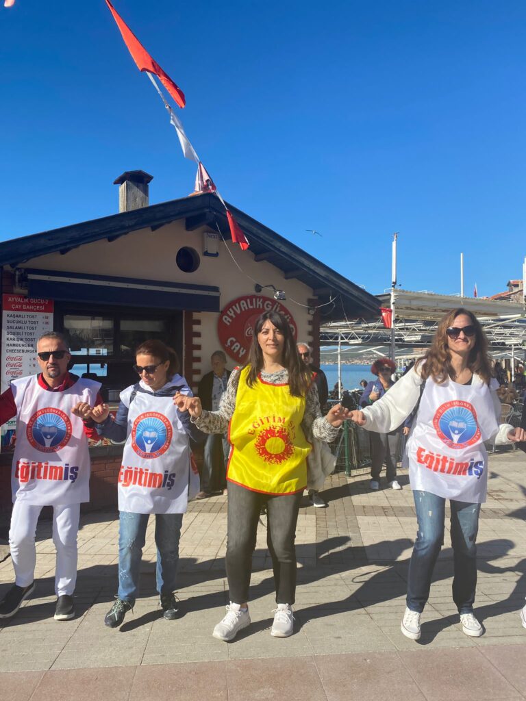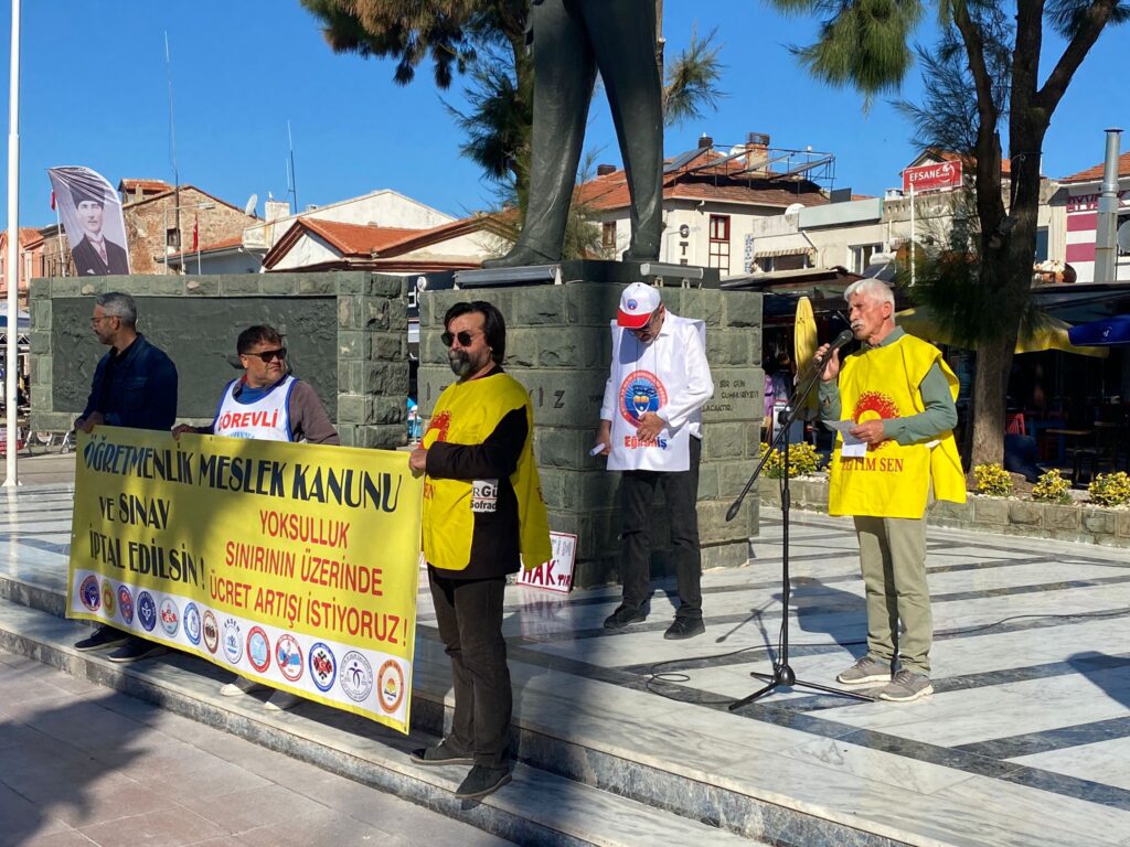 Eğitim -Sen Ayvalık Temsilciliği adına açıklama yapan şube başkanı Ersin Ayar, ” Öğretmenlik mesleğini itibarsızlaştıran, öğretmenlerin ekonomik sorunlarına çözüm üretmeyen, eşit işe eşit ücret ilkesini ortadan kaldıran, öğretmenler arasındaki ayrımcılığı ve eşitsizliği derinleştiren Öğretmenlik Meslek Kanunu (ÖMK) düzenlemesine yönelik yoğun tepkilere rağmen, MEB ısrarla somut bir adım atmamaktadır.