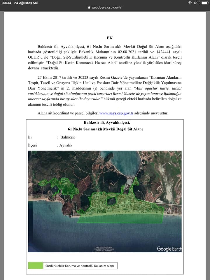 Ayvalık Tabiat Platformu eş sözcüsü Nebahat Dinler, “Mevcutta da 1. Derece Doğal Sit Alanı olan yer statüsü korunarak Kesin Korunacak Hassas Alan olarak tescillendi. Biz Bakanlığın 2017 yılında göndermiş olduğu öneri paftaları inceleyerek hazırladığımız raporu bakanlığa iletmiştik. Ayvalık genelinde ve Tabiat Parkındaki doğal sit alanlarının statülerinin düşürülmeden korunmasını istiyoruz. Ayvalık’ın Nadide yeri Sefa çamlık mesire alanı ile tabiat Parkı içindeki manastır( güvercin ) adasının 1. Derece Doğal sit alanı iken statülerinin düşürülerek Nitelikli Koruma Alanı olarak tescil edilmelerine karşı Balıkesir İdare Mahkemesi tarafından iptal edildi. Ayvalık Tabiat Derneği adına Balıkesir idare mahkemesinde iptal davası açtık.” Dedi.