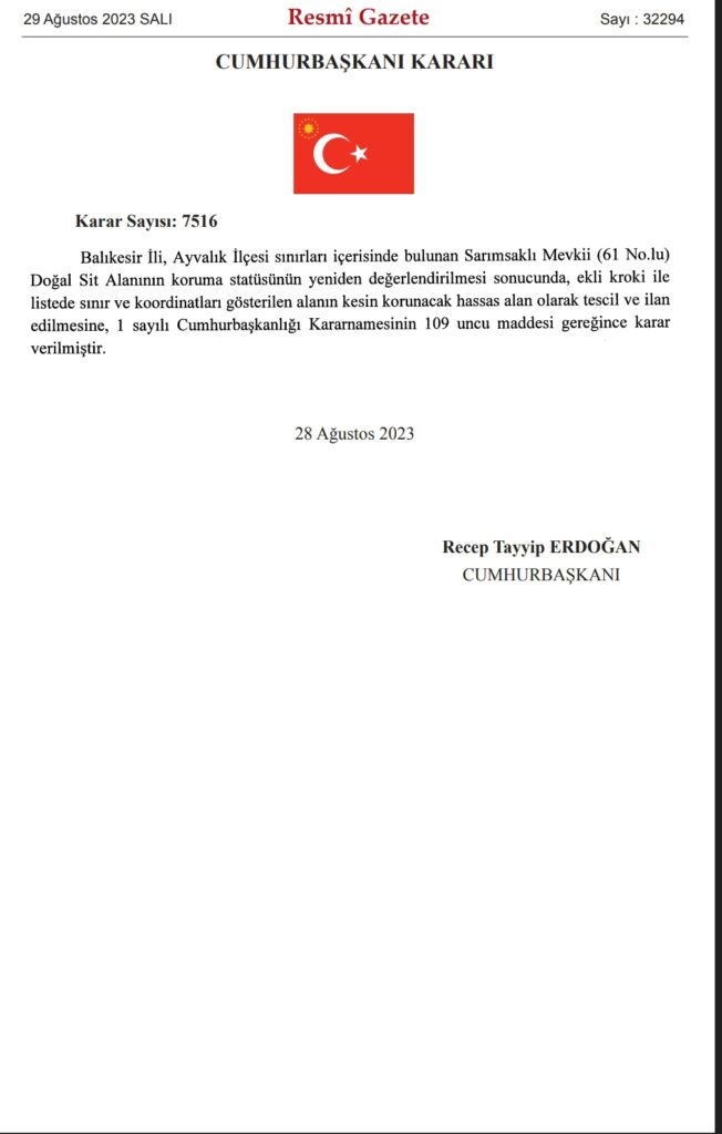 Resmi Gazete’de yayınlanan Cumhurbaşkanlığı kararıyla Balıkesir ve Tunceli’de iki doğal sit alanının statüsü ‘Kesin korunacak Hassas Alan’ olarak değiştirildi.