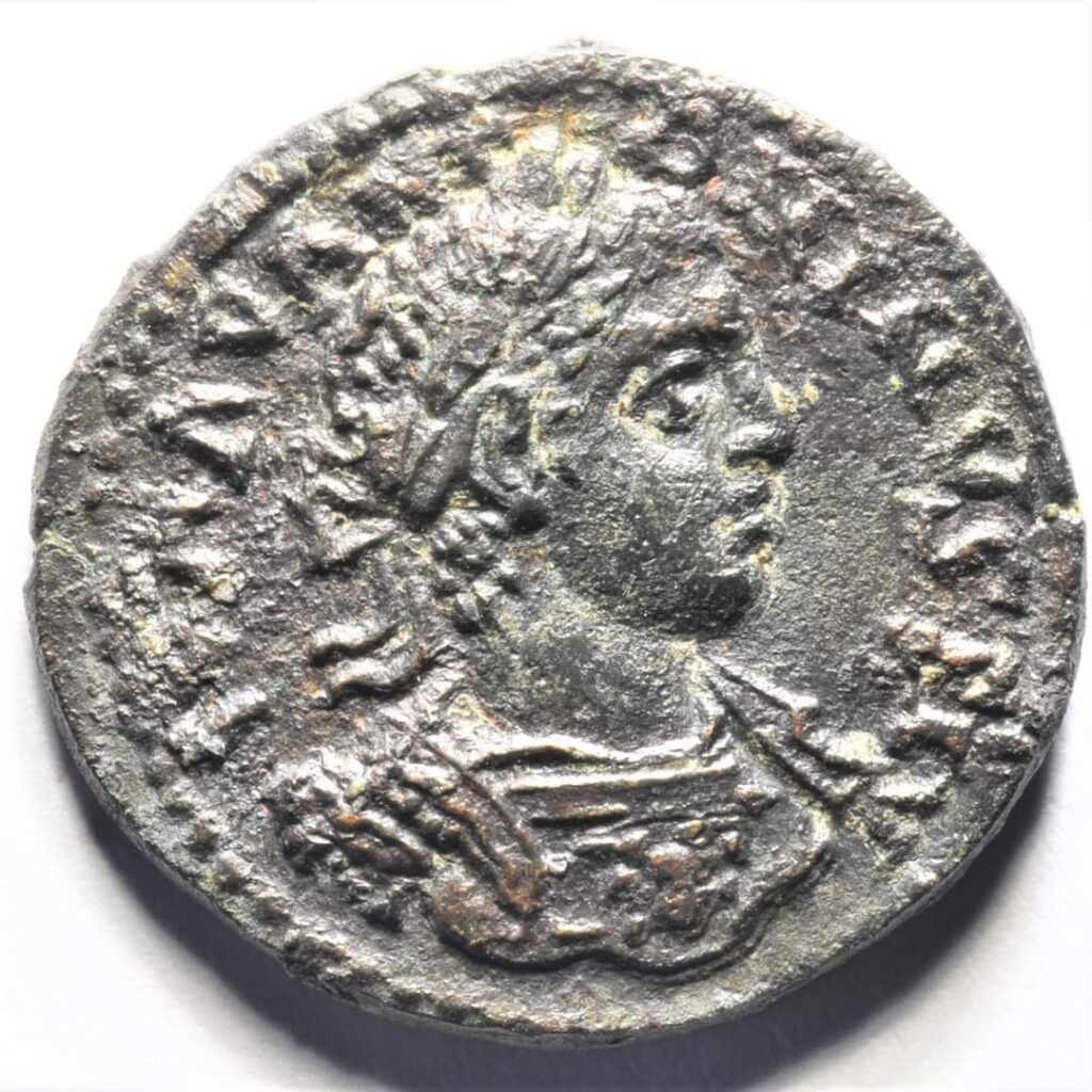 Troas’ın önemli şehri Alexandria Troas’ın bu sikkesinde ön yüzde İmparator Caracalla’nın portresi vardır. Arka yüzde ise etrafındaki satyrlerle ( uzun kulaklı, boynuzlu,teke ayaklı yaratıklar) yürüyen sarhoş Heracles’in betimini görmekteyiz. Bronz, 8,7 gr. 25 mm. Env.no. 2178