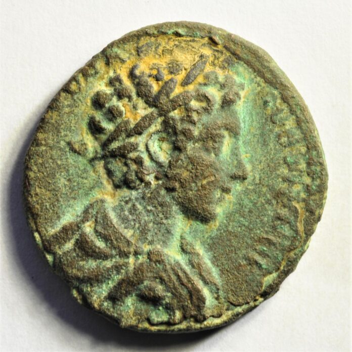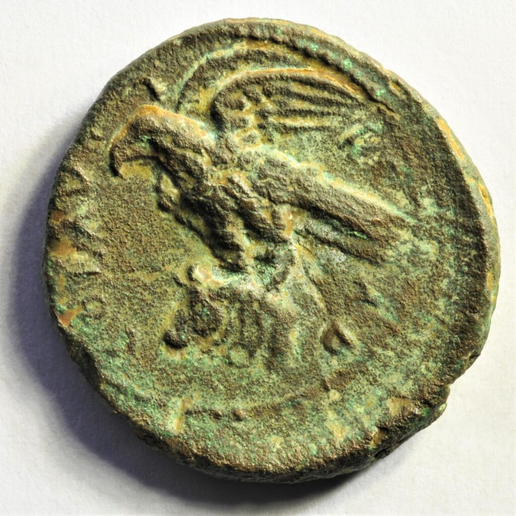 MS 172-173 yıllarında Aleksandria Troas kentinde basılan bu bronz sikkenin ön yüzünde imparator Commodus’un portresi, arka yüzünde de pençelerinde bir boğa başı taşıyan kartal tasviri kullanılmıştır.
