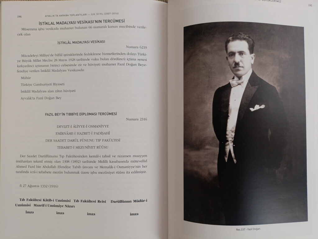 Ömer ÖZYİĞİT- Akraba toplantılarımıza çok sayıda aileler katıldı. Bu aileler içerisinde çok sayıda soyadları farklı olanlar bulunuyor. Ama bir taraftan akrabalık değiyor hepimize. Bunları burada sayamam açıkçası eksik kalır o bakımdan buna ne kadar girersem doğru olur mu bilemiyorum; ama bunlardan bazılarını sayabiliriz diye düşünüyorum. Bu akraba gruplarını soyadlarına göre şöyle sıralayabiliriz: Asena, Doğan, Özyiğit, Kayan, Soral, Ataçeri, Gürçay, Varinlioğlu, Yereli, Sabuncugil, Güçük, Tarlan, Esen, Kantarcı, Savaş, Çakmak, Yur, Kurul, Karaca, İnci, Aydın, Cömert, Vodina, Başak, Gürsoy, Durmuş, Cimit ve Kaynar ailelerini sayabilirim. Daha da başka aileler de muhakkak vardır; çünkü bunlar oldukça geniş bir topluluk idi. Kitapta bazı ailelerin hikayeleri yer alıyor ve kitabın 3. Bölümü, aramızda olmayan iz bırakan bazı büyüklerimiz başlığıyla yayınlandı. Bunlar arasında özellikle Özyiğit ailesinin yakınlarıyla ilgili daha fazla makaleler var. Burada Muhip Özyiğit, Meliha Alatur, İhsan Eşsiz ve Fazıl Doğan’ın tanıtılması önemliydi. Onun dışında Tipi ailesi ve Sabuncugil aileleri ile Akın aileleri ön plandaydı. Madra ailesinden de tanıtımlar yine önemliydi. Burada tanıtılan kişiler Ayvalık’ın ileri gelen kişileriydi. Ayvalık’ın ilk sosyal yapısını oluşturan kişilerdi ve içerisinde çok önemli kişiler vardı. Bunlar içerisinde özellikle Fazıl Doğan, Kurtuluş Savaşı kahramanlarından ve İstiklal Madalyası sahibidir. Aynı zamanda kendisi Tıp alanında Kadın Doğum doktoruydu. Kurtuluş Savaşı sırasında 1919-1922 arasında Kütahya Emet’te çok önemli büyük işler yapmış, daha sonra 1923’de Ayvalık’a gelerek de çok büyük kültür savaşçılığı yaparak Ayvalık’ı önemli noktalara getirmiş bir kişidir. Yine Eski belediye Başkanlarından Muhip Özyiğit, Ayvalık Lisesi’nin ilk kurucusu İhsan Eşsiz ve daha birçok kişiler.. Kitapta bunlar uzun uzun anlatılıyor. Bu kişilerin hepsi, Ayvalık’ın sosyal ve kültürel yapısına önemli katkılarda bulunan kişilerdi.