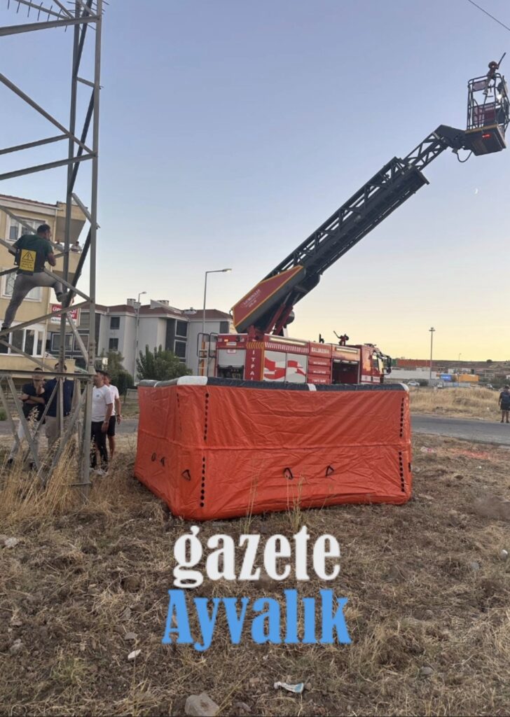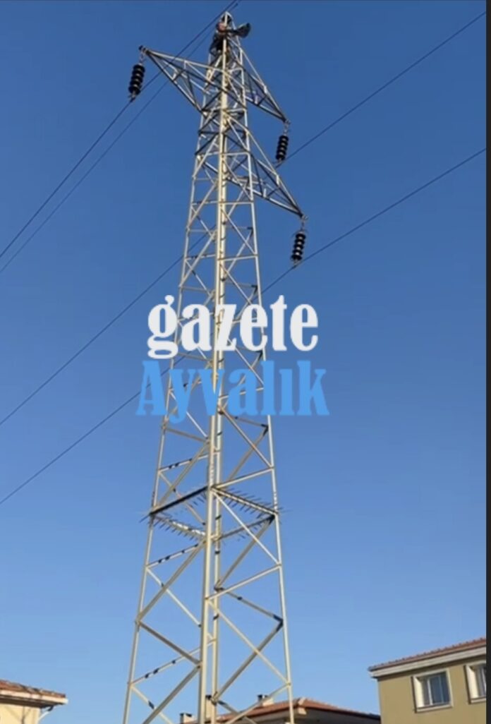 Ayvalık’ta Ekipler Yüksek Gerilim Direğinde Bulunan Vatandaşı Güvenle İndirdi
