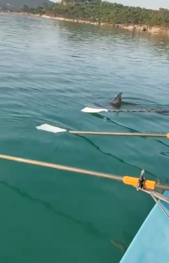 Çamlık Paşa Limanı tarafında kürek çekerken uzak bir noktada yunusu fark eden vatandaşlar, yakınlarına gelen Yunus'un, kürek teknesinin sağından soluna geçip küreklere kafasıyla vurarak oyun oynamak istemesini ilgiyle izledi. Teknede kürek çekenlerden biri olan Müge Kubilay, "İki günde bir kürek çekiyoruz...