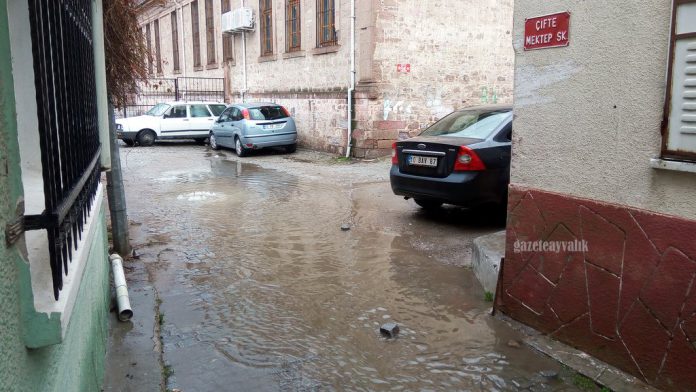 Her yağmur yağdığında ‘Venedik’i andıran görüntülerin yaşandığı Ayvalık’ın merkezindeki Çifte Mektep Sokağı, Cumartesi günü meydana gelen yağmurun etkilerini hala yaşıyor. Gazi Ortaokulu ile sokağın girişi arasındaki rögardan 4 gündür taşmaya devam eden sular, sokaktan geçilmesini de engelliyor.