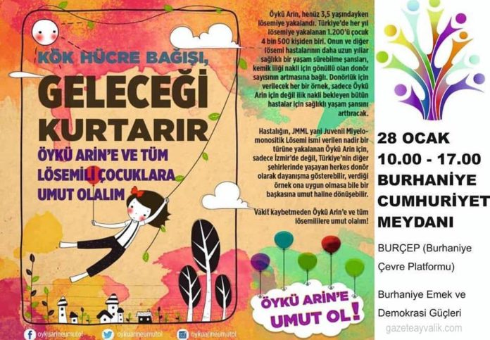 Nadir görülen Juvenil Miyelomonositik Lösemi (JMML) tanısı koyulan ve ilik nakli olmayı bekleyen İzmirli 3,5 yaşındaki Öykü Arin Yazıcı’nın tedavisi sürüyor. Minik Öykü için Almanya’da yaşayan Türkler de başta olmak üzere tüm Türkiye birleşti. Burhaniye'den de Öykü’ye destek geldi. Öykü Arin’e destek için 28 Ocak Pazartesi Günü 10.00 – 17.00 saatleri arasında Burhaniye Cumhuriyet Meydanı'nda kök hücre bağışı...