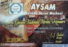 AYSAM-AYVADA Sanat Merkezi, 14 Şubat Perşembe akşamı, 'Sıra gecesi tadında Türkü' konseri düzenleyecek. İsmet İnönü Kültür Merkezi'ndeki konser saat 20.30'da başlayacak.
